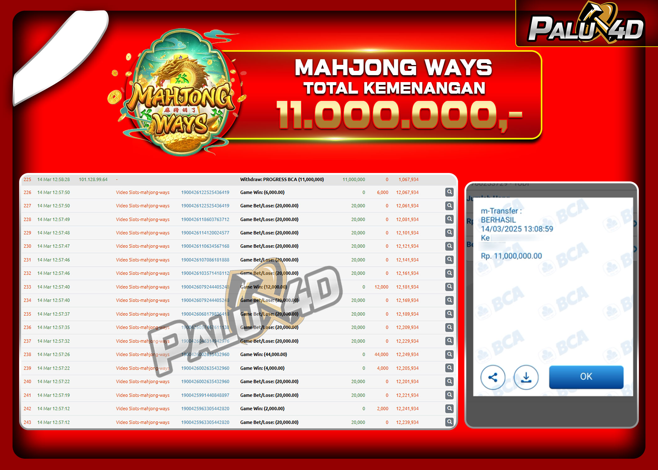 PALU4D – Selamat bagi pemenang yang mendapatkan jackpot hari ini 13 Maret 2025 di game Slot MAHJONG WAYS  yang di sediakan situs palu4d dan sudah kami bayar lunas. Berikut data pemenang hari ini yang kami proses dengan cepat ke rekening tujuan yang terdaftar di akun selama ±10 menit.