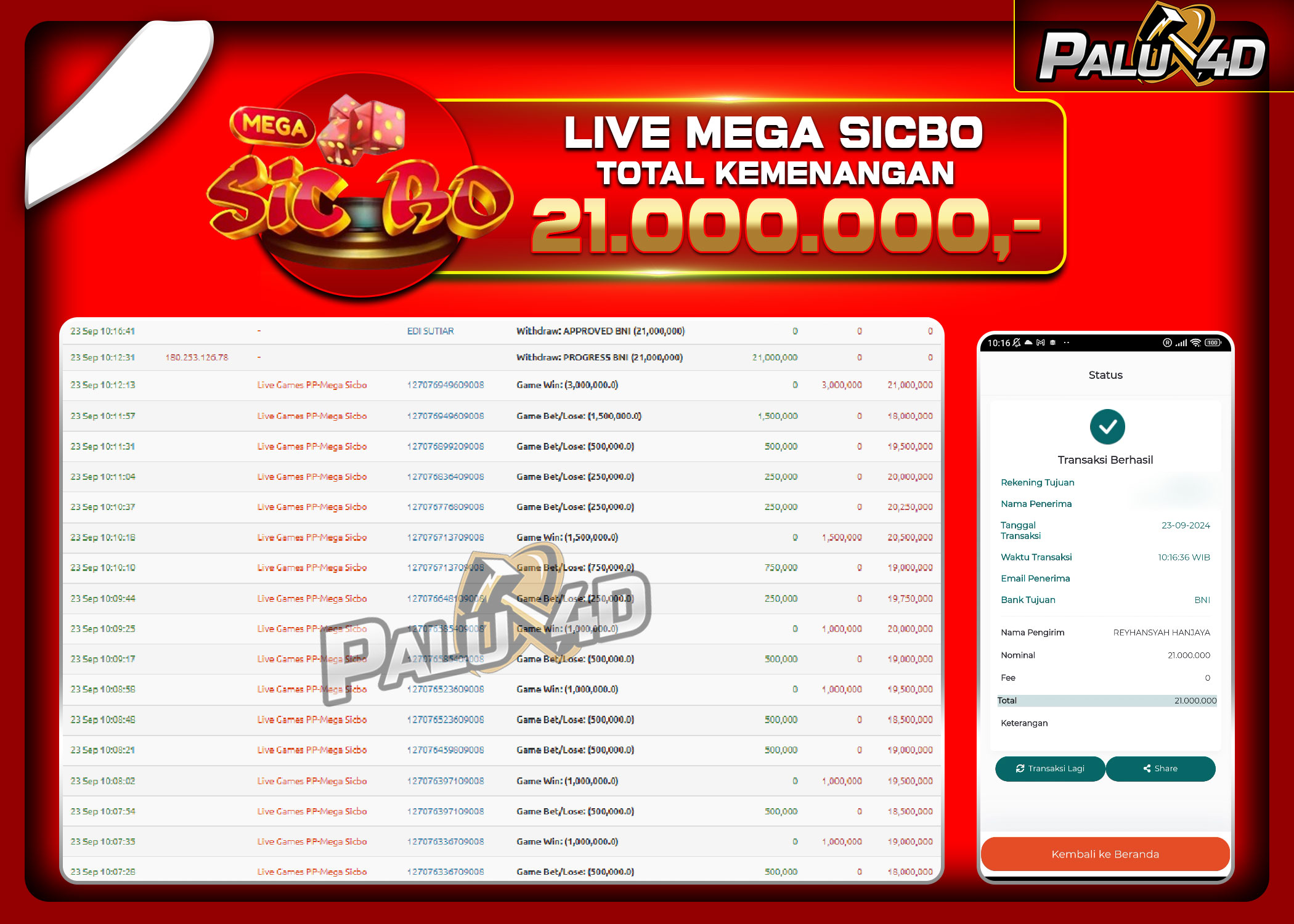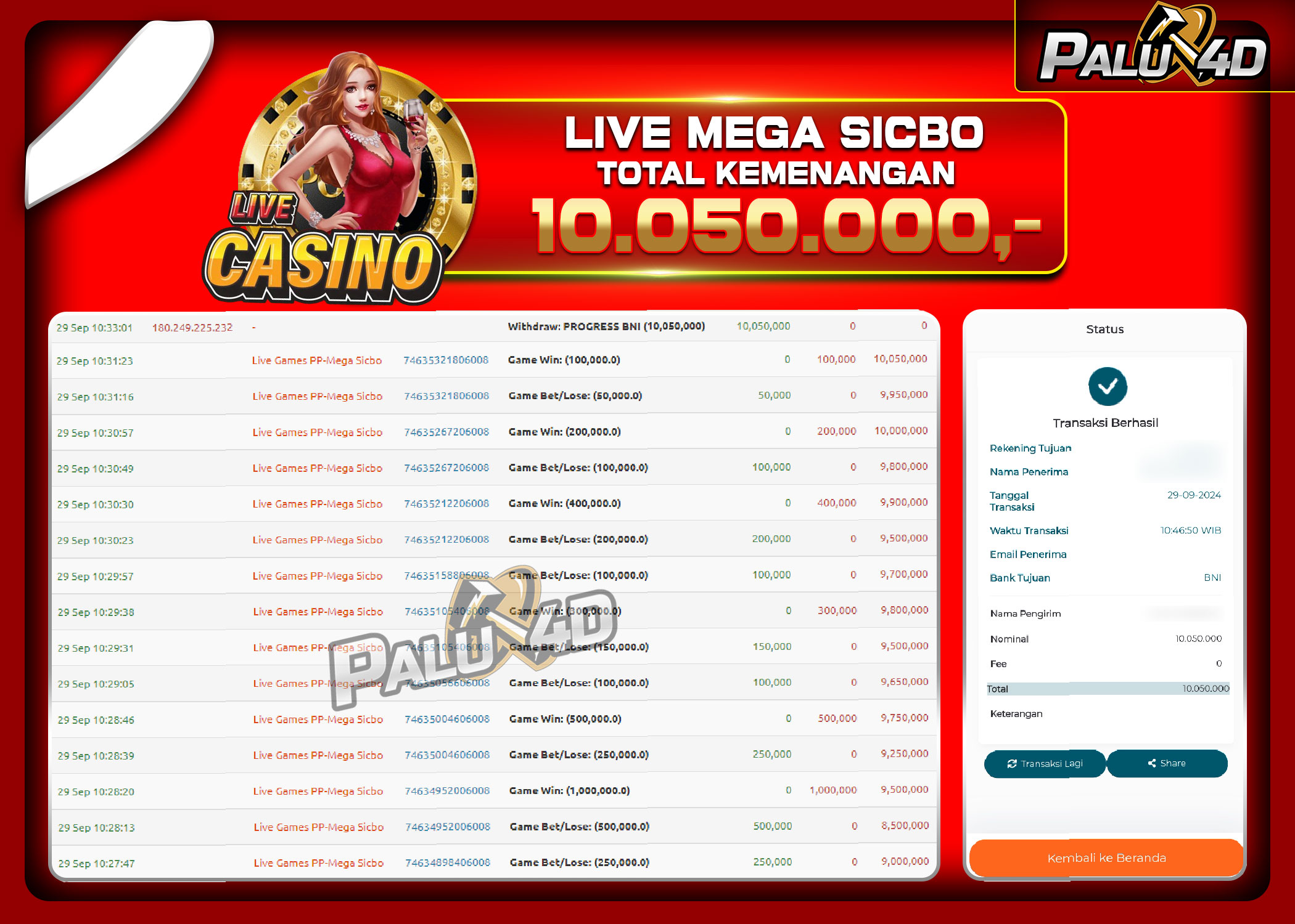 29/09/2024LIVE CASINO PALU4D – Menang Live Games MEGA SICBO Rp10.050.000.,- LUNAS PALU4D – Menang Live Games MEGA SICBO Rp10.050.000.,- LUNAS PALU4D – Selamat bagi pemenang yang mendapatkan jackpot hari ini 29 SEPTEMBER 2024 […]