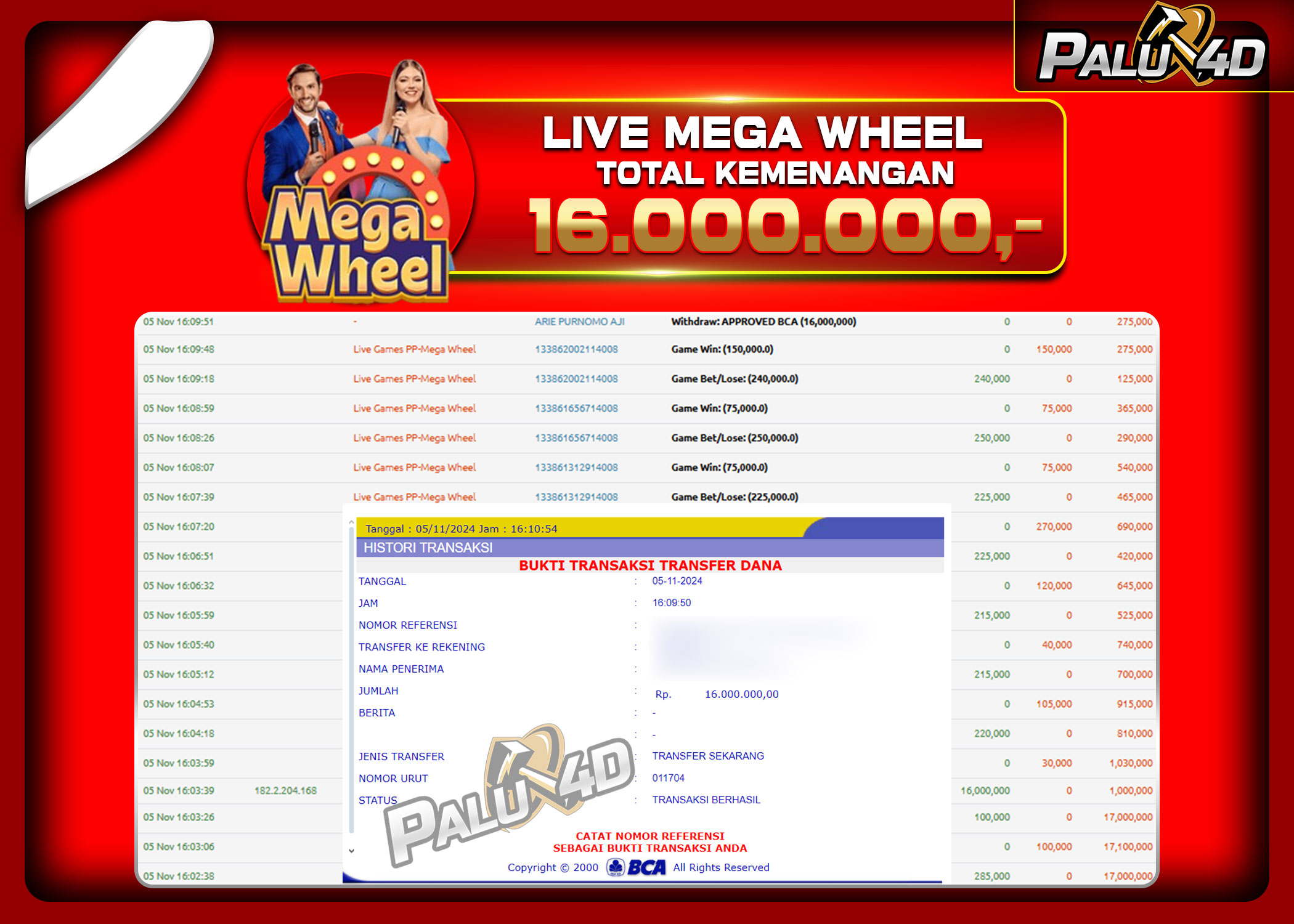 06/11/202406/11/2024LIVE CASINO PALU4D – Menang LIVE CASINO MEGA WHEEL Rp.16.000.000.,- LUNAS PALU4D – Menang LIVE CASINO MEGA WHEEL Rp.16.000.000.,- LUNAS PALU4D – Selamat bagi pemenang yang mendapatkan jackpot hari ini 5 November 2024 […]