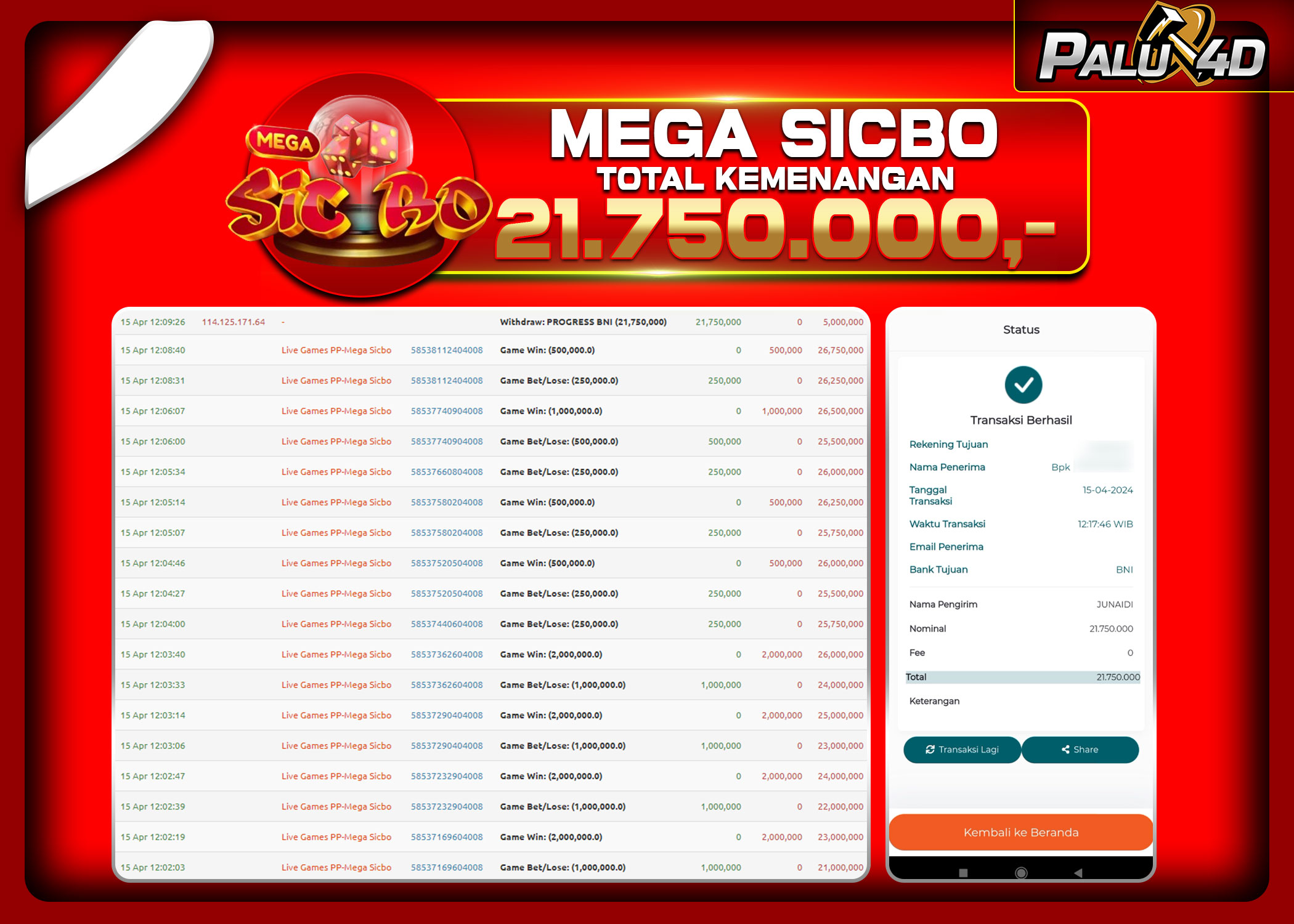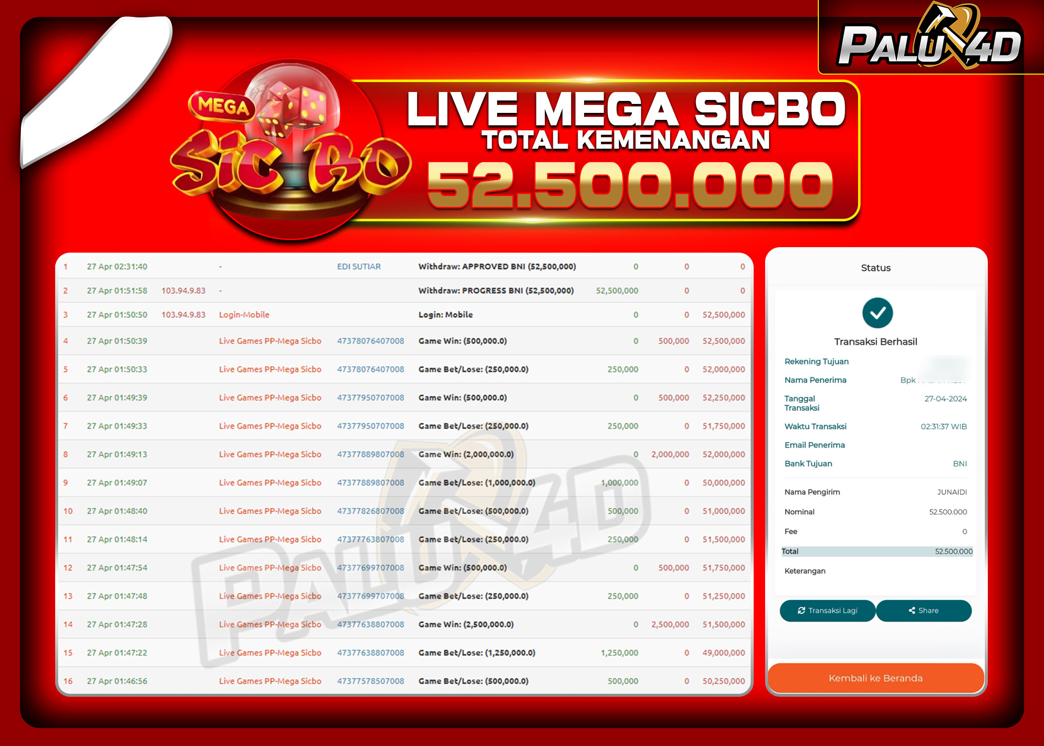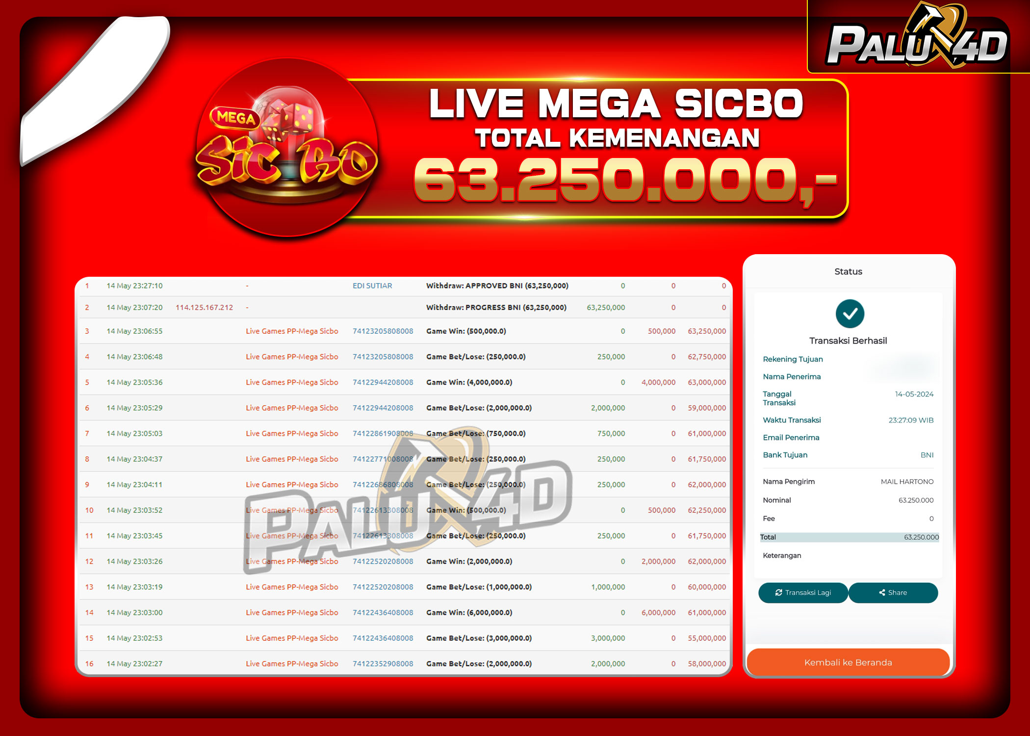 28/05/2024LIVE CASINO PALU4D – Menang Live Games MEGA SICBO Rp50.000.000.,- LUNAS PALU4D – Menang Live Games MEGA SICBO Rp50.000.000.,- LUNAS PALU4D – Selamat bagi pemenang yang mendapatkan jackpot hari ini 4 April 2024 […]