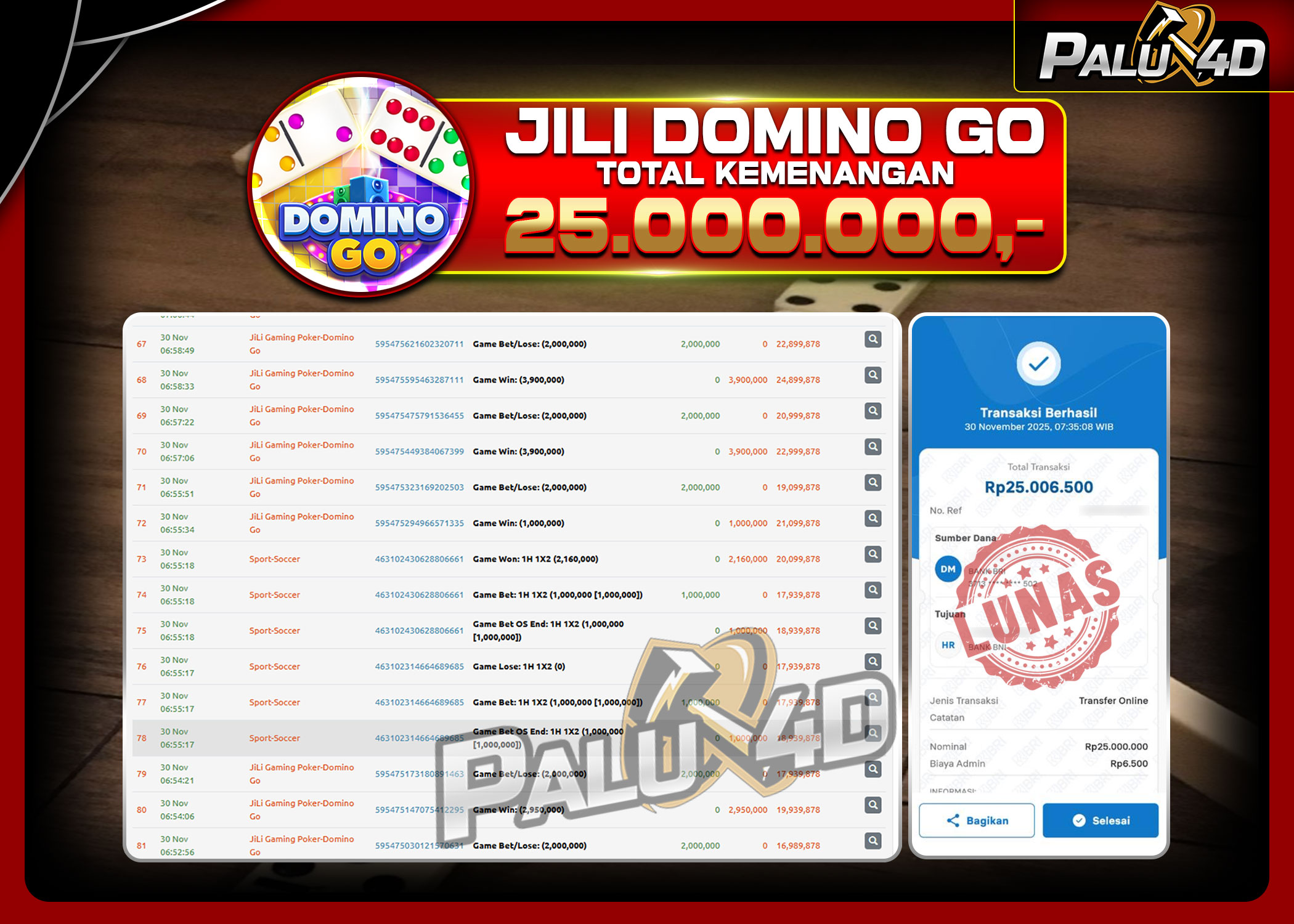 06/12/202516/01/2026LIVE CASINO PALU4D – Menang Live Games DOMINO GO Rp 25.000.000.,- LUNAS PALU4D – Menang Live Games DOMINO GO Rp 25.000.000.,- LUNAS PALU4D – Selamat bagi pemenang yang mendapatkan jackpot hari ini 30 NOVEMBER 2025 […]
