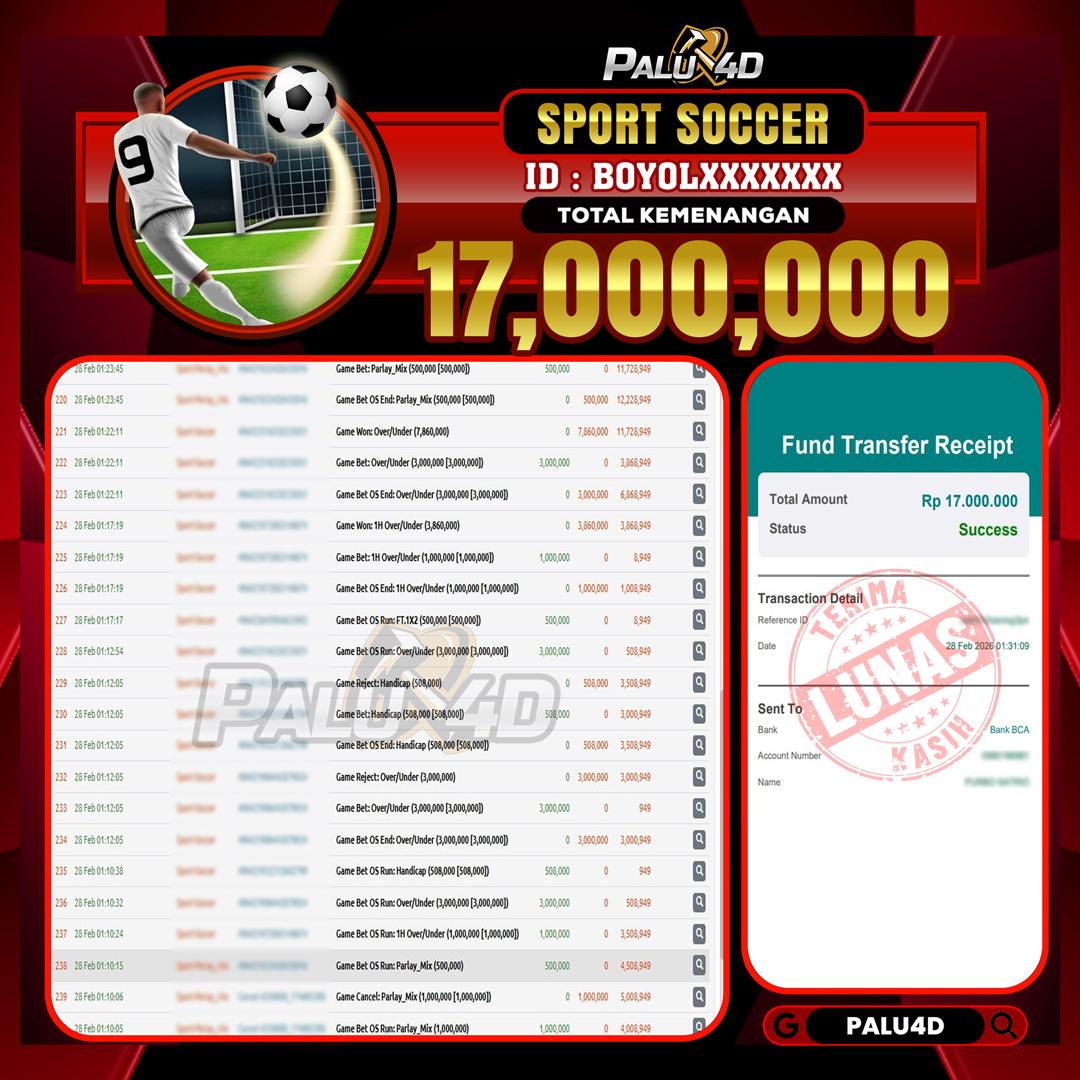 PALU4D – Menang SPORTBOOKS TARUHAN BOLA Rp.17.000.000.,- LUNAS