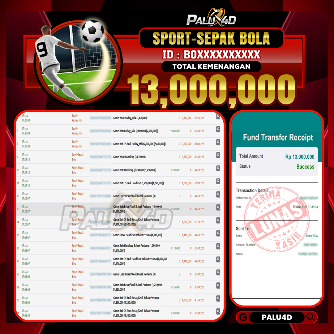PALU4D – Menang SPORTBOOKS TARUHAN BOLA Rp.13.000.000.,- LUNAS