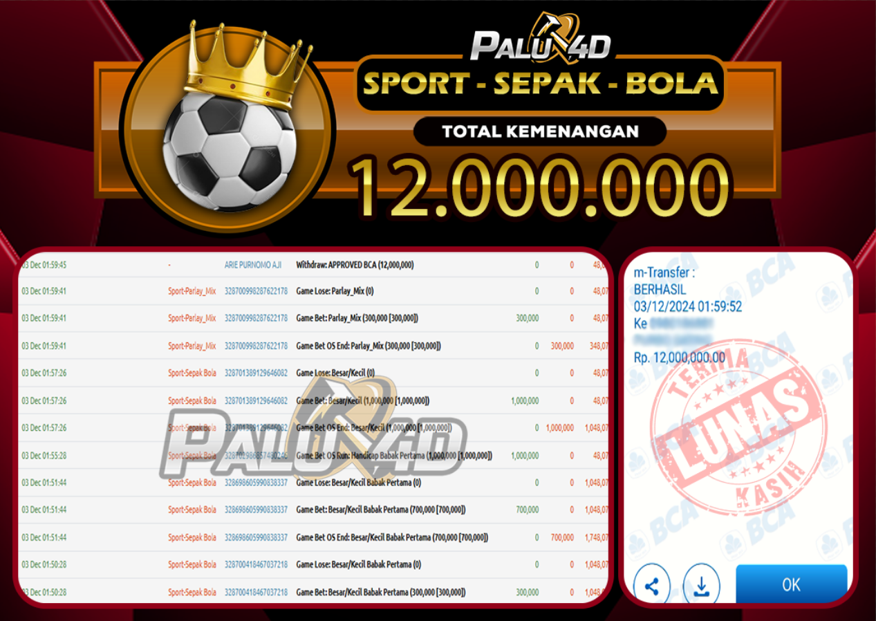 PALU4D – Menang SPORTBOOKS TARUHAN BOLA Rp.12.000.000.,- LUNAS