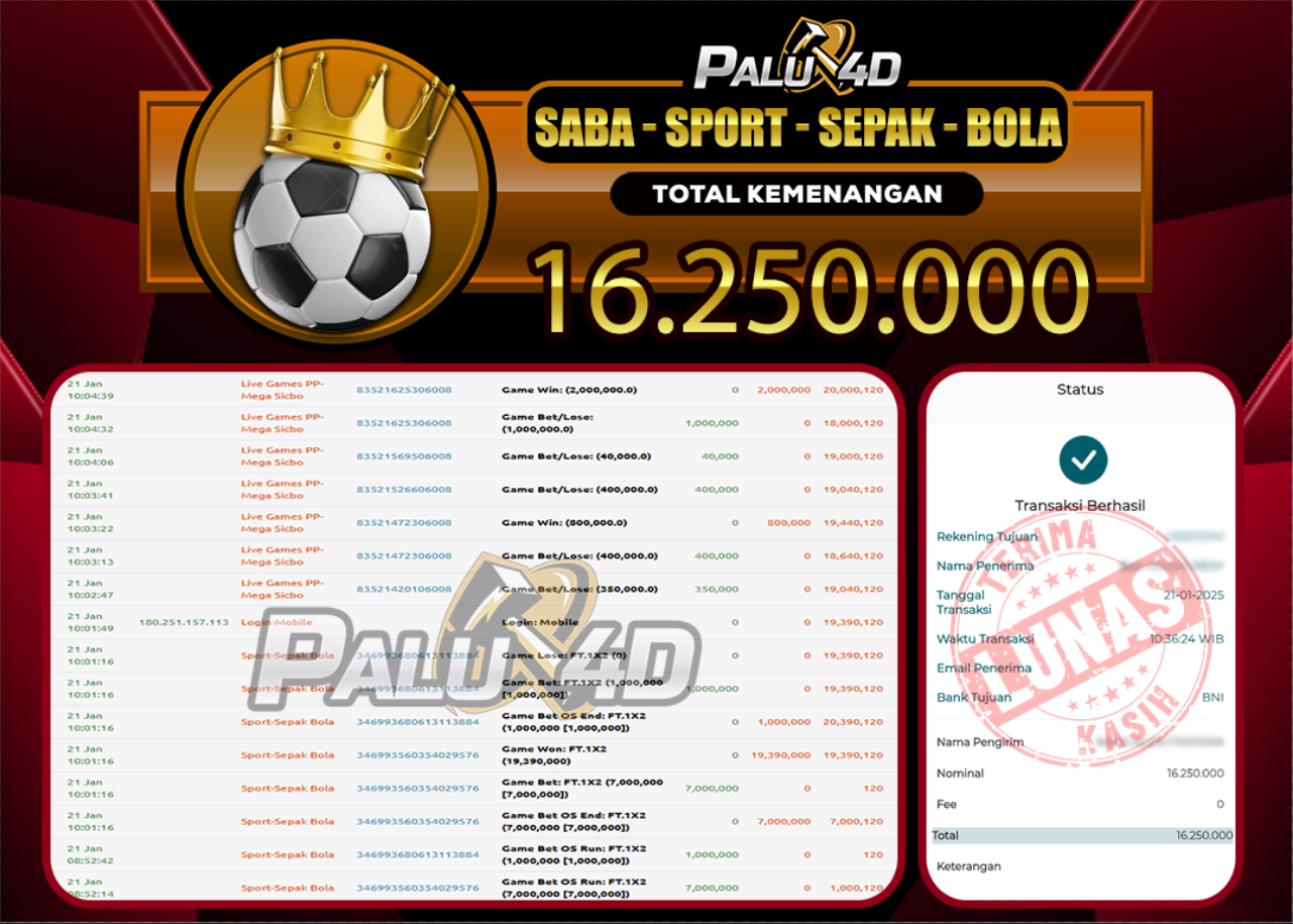 PALU4D – Menang SPORTBOOKS TARUHAN BOLA Rp.16.250.000.,- LUNAS