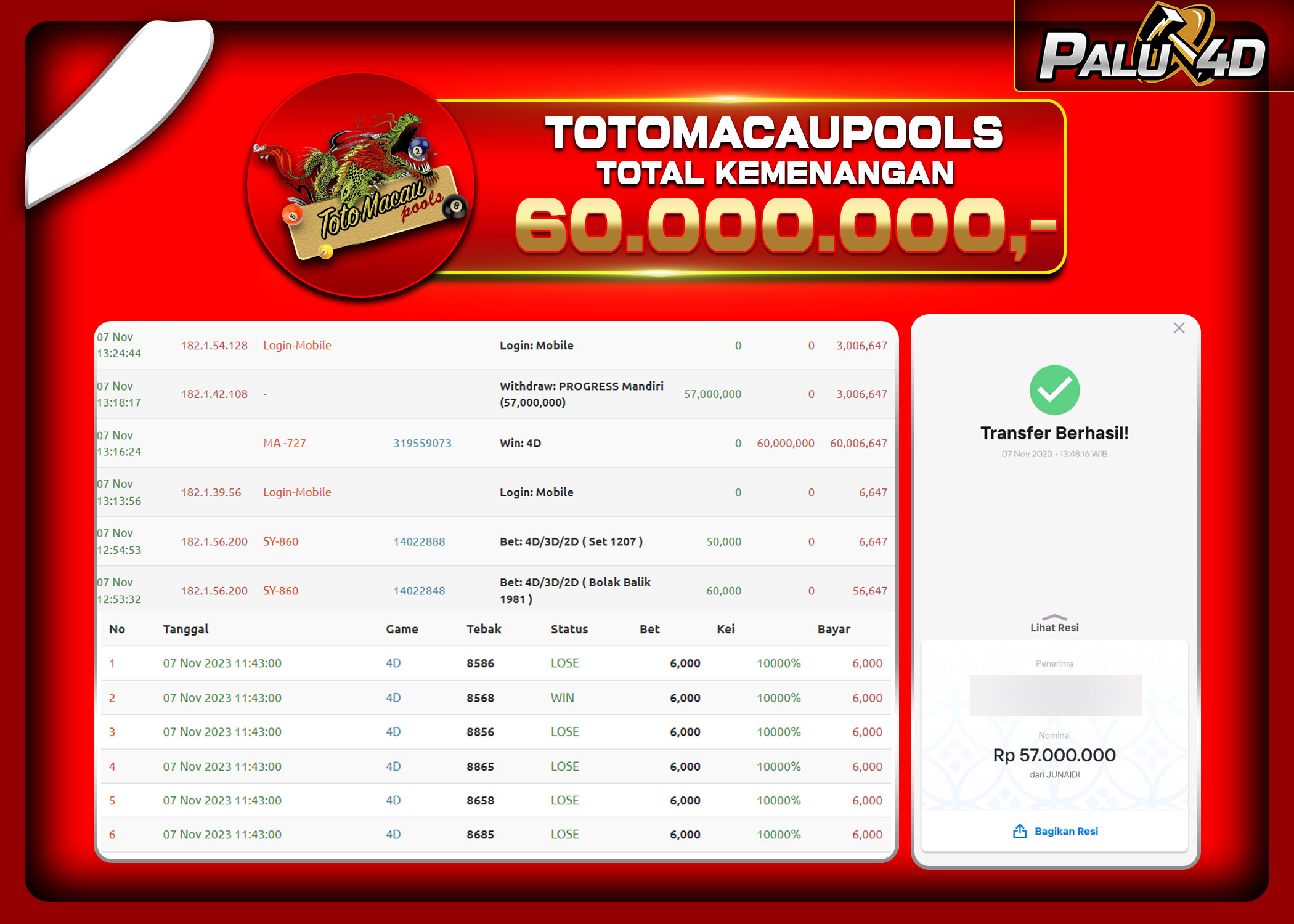 PALU4D – Menang Togel TOTOMACAU Rp.60.000.000.,- LUNAS