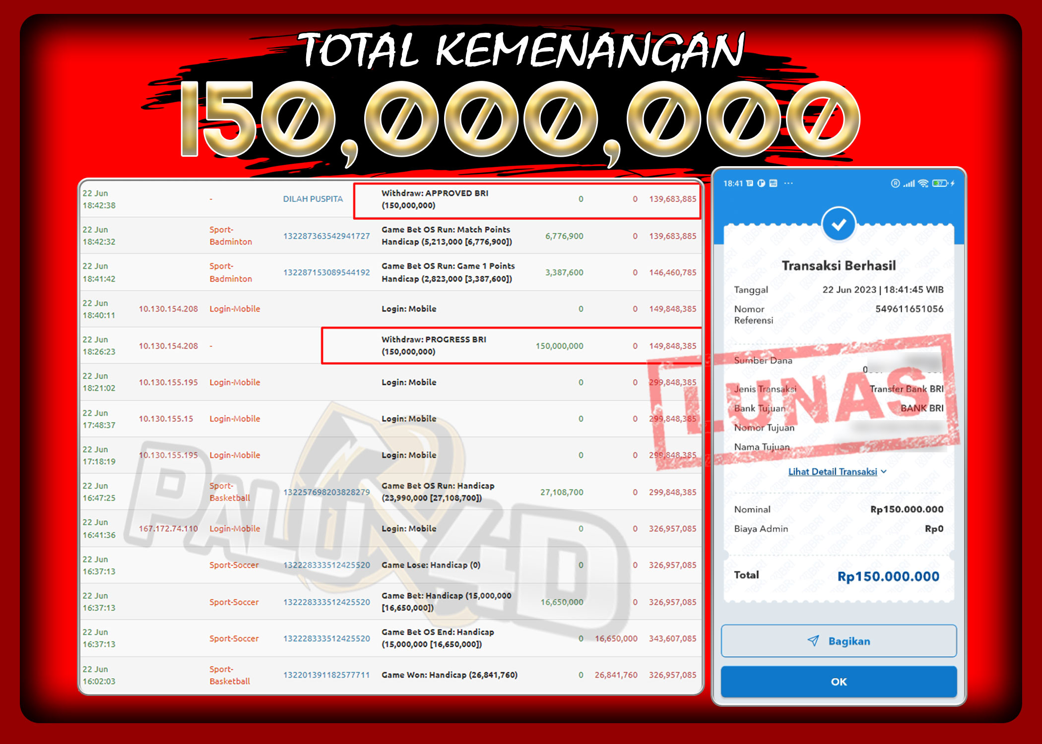 PALU4D – Menang Sportbook TARUHAN BOLA Rp.150.000.000.,- LUNAS