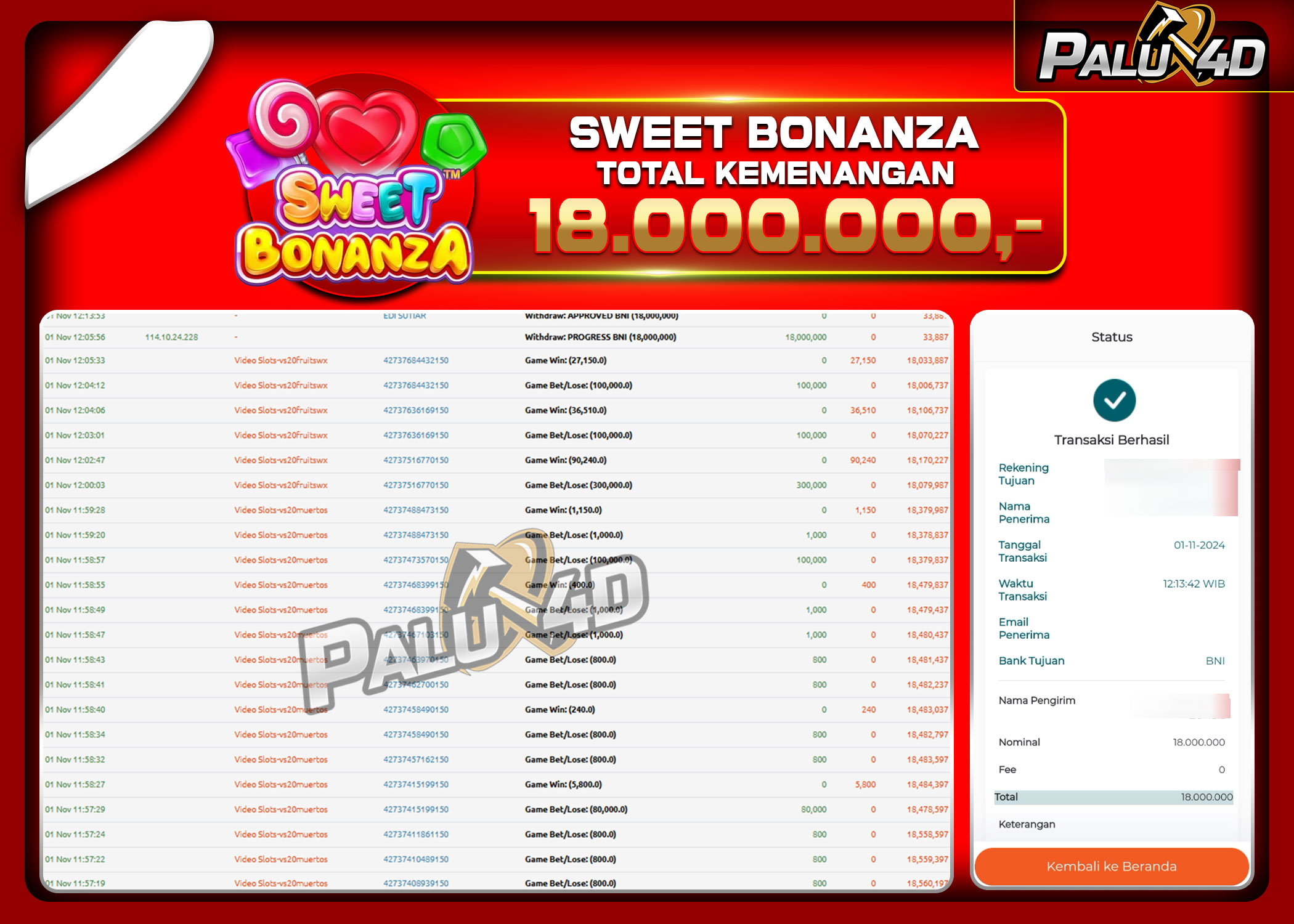 PALU4D – Menang Slot SWEET BONANZA Rp.18.000.000.,- LUNAS
