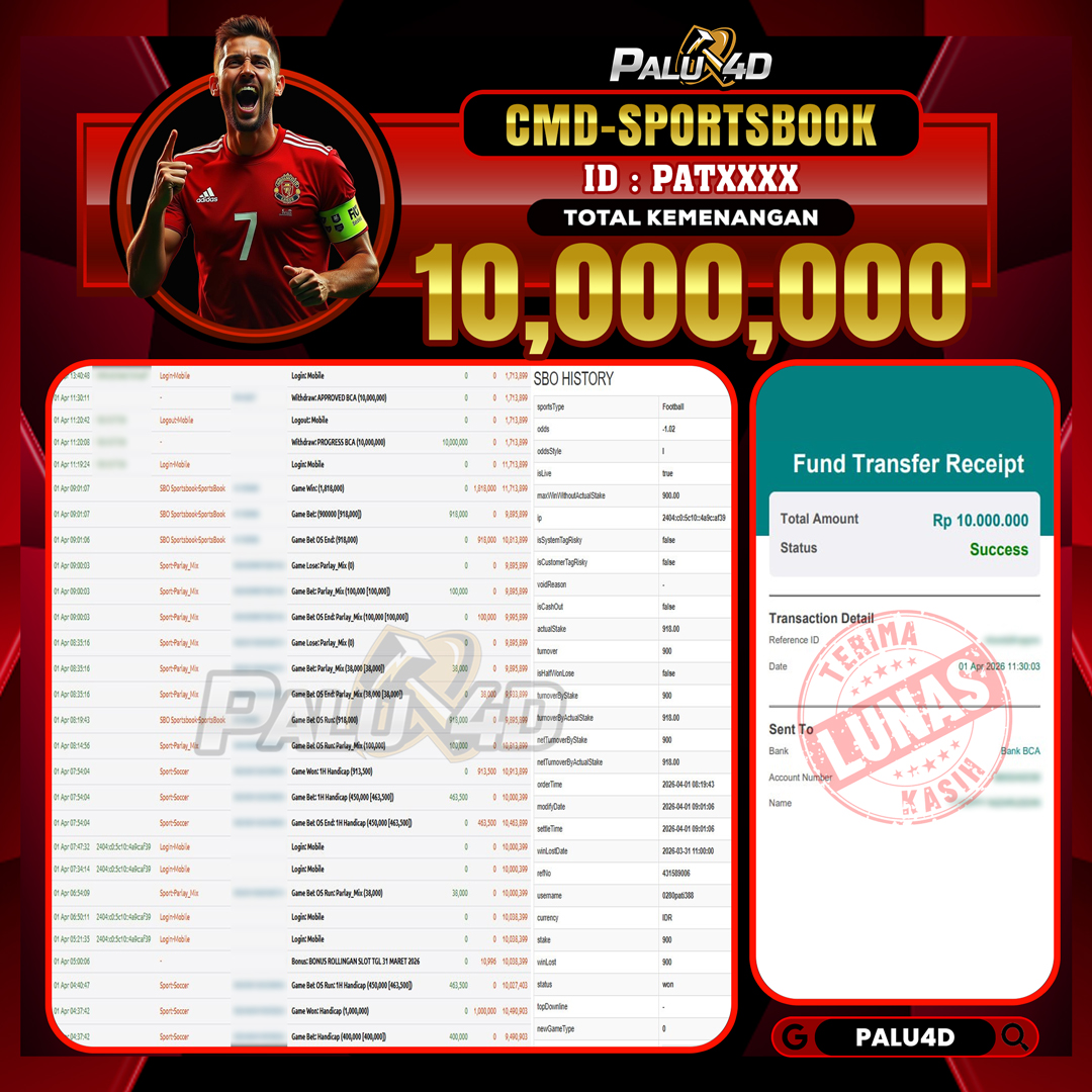 PALU4D – Selamat bagi pemenang yang mendapatkan jackpot hari ini 01 APRIL 2026 di game Sportbook TARUHAN BOLA yang di sediakan situs palu4d dan sudah kami bayar lunas. Berikut data pemenang hari ini yang kami proses dengan cepat ke rekening tujuan yang terdaftar di akun selama ±10 menit.