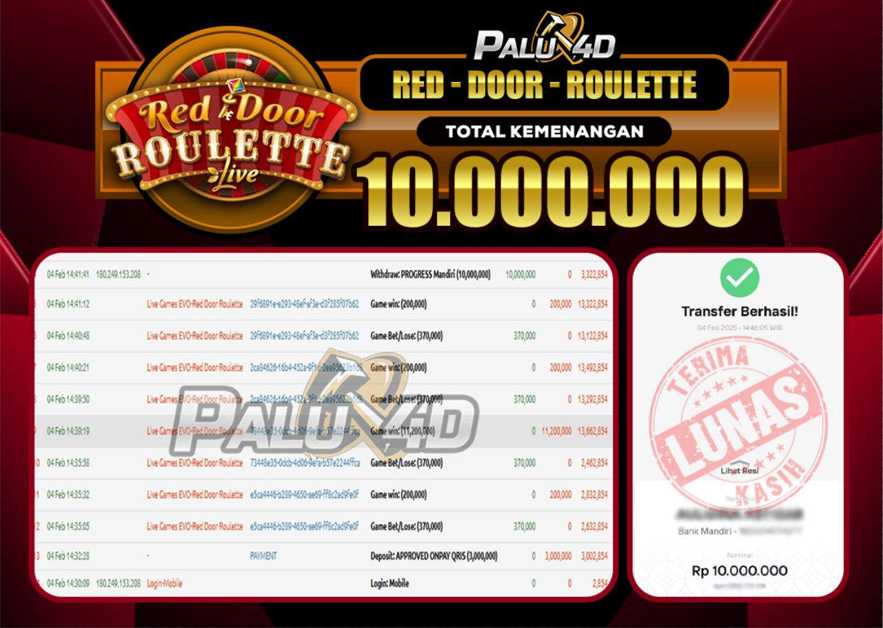PALU4D – Menang LIVE CASINO RED DOOR ROULETTE   Rp.10.000.000.,- LUNAS