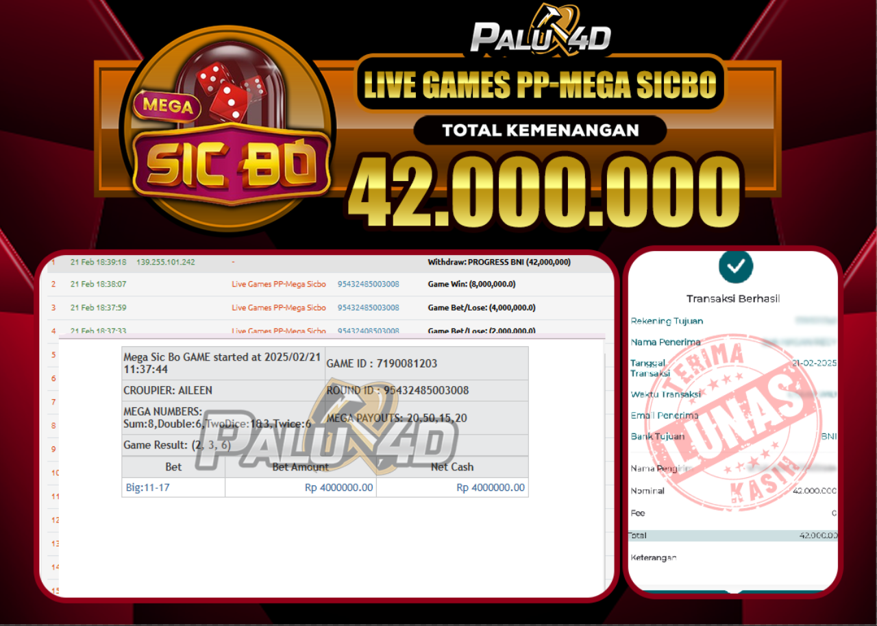 PALU4D – Menang Live Games MEGA SICBO Rp 42.000.000.,- LUNAS