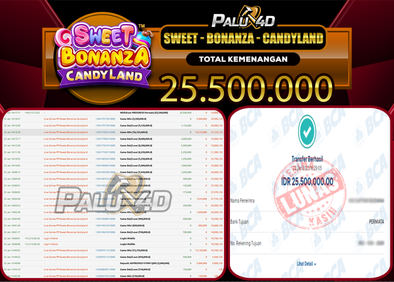 PALU4D – Menang LIVE CASINO SWEET BONANZA CANDYLAND Rp.25.500.000.,- LUNAS