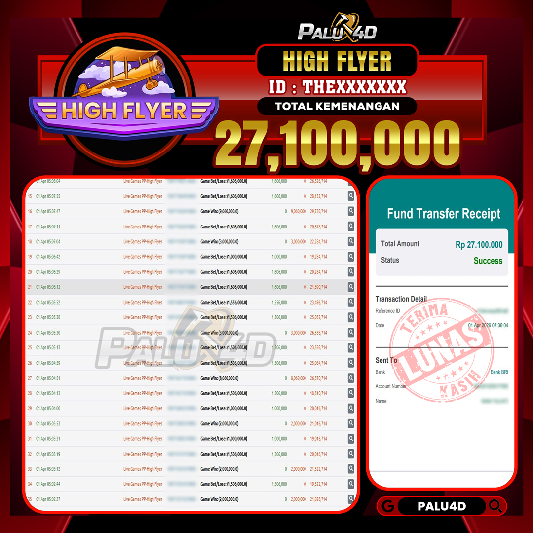 PALU4D – Selamat bagi pemenang yang mendapatkan jackpot hari ini 01 APRIL 2026 di game LIVE CASINO HIGH FLYER yang di sediakan situs palu4d dan sudah kami bayar lunas. Berikut data pemenang hari ini yang kami proses dengan cepat ke rekening tujuan yang terdaftar di akun selama ±10 menit.