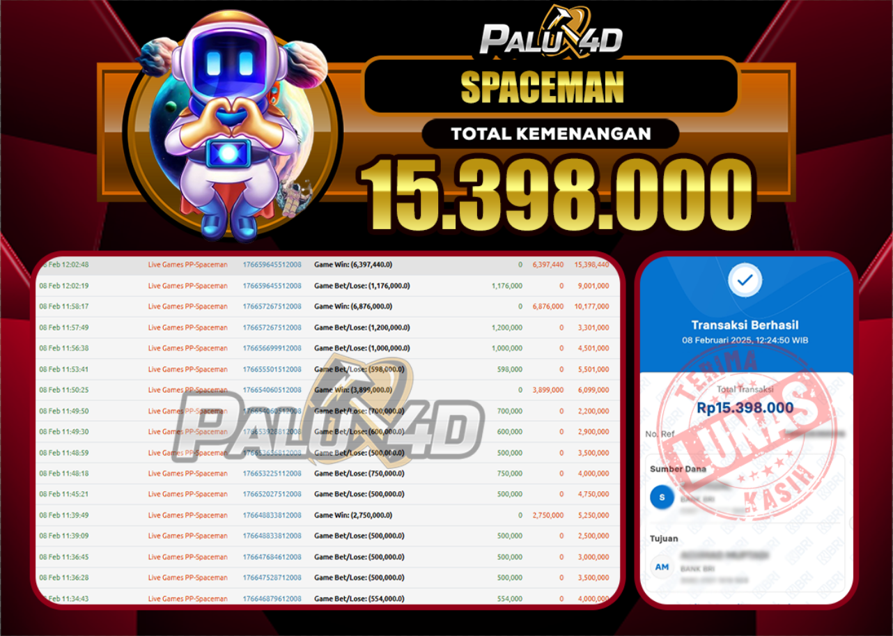 PALU4D – Selamat bagi pemenang yang mendapatkan jackpot hari ini 08 February 2025 di game Live Casino SPACEMAN   yang di sediakan situs palu4d dan sudah kami bayar lunas. Berikut data pemenang hari ini yang kami proses dengan cepat ke rekening tujuan yang terdaftar di akun selama ±10 menit.