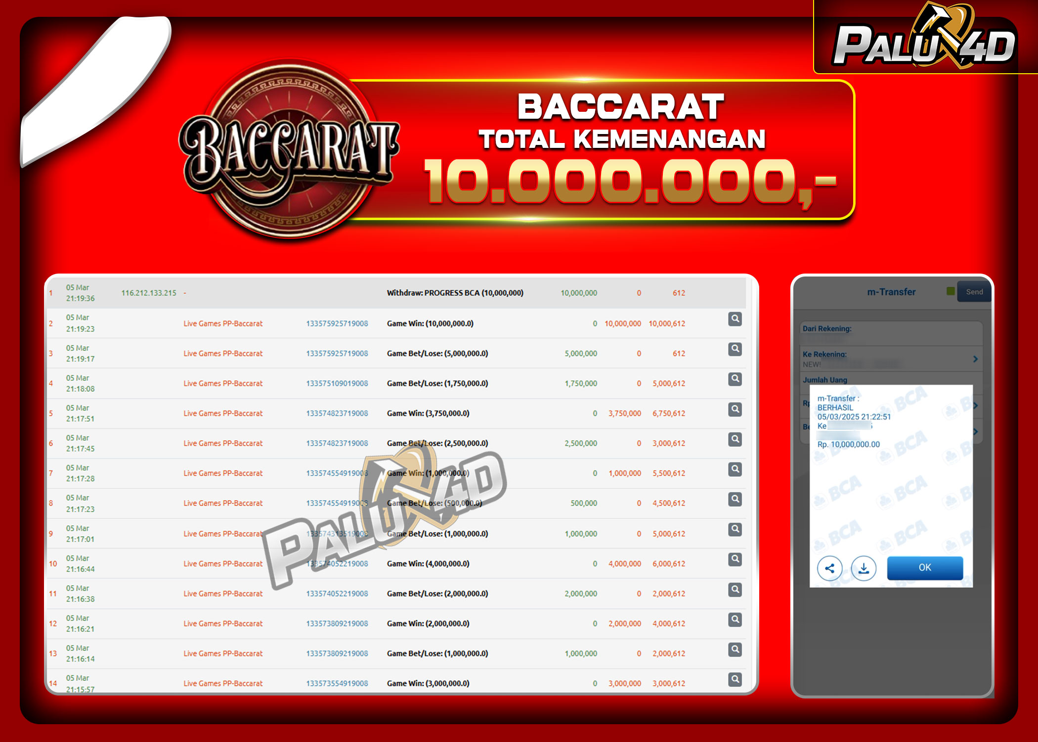 PALU4D – Selamat bagi pemenang yang mendapatkan jackpot hari ini 05 Maret 2025 di game Live Games BACCARAT yang di sediakan situs palu4d dan sudah kami bayar lunas. Berikut data pemenang hari ini yang kami proses dengan cepat ke rekening tujuan yang terdaftar di akun selama ±10 menit.