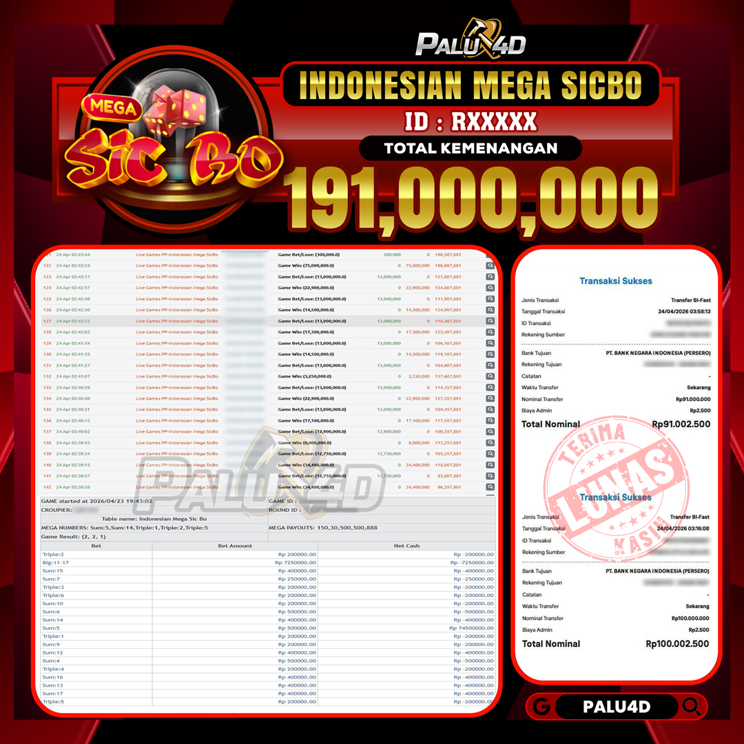 PALU4D – Selamat bagi pemenang yang mendapatkan jackpot hari ini 24 APRIL 2026 di game Live Games INDONESIAN MEGA SICBO  yang di sediakan situs palu4d dan sudah kami bayar lunas. Berikut data pemenang hari ini yang kami proses dengan cepat ke rekening tujuan yang terdaftar di akun selama ±10 menit.