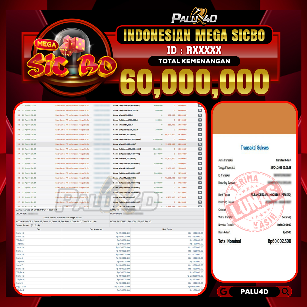 PALU4D – Selamat bagi pemenang yang mendapatkan jackpot hari ini 22 APRIL 2026 di game Live Games INDONESIAN MEGA SICBO yang di sediakan situs palu4d dan sudah kami bayar lunas. Berikut data pemenang hari ini yang kami proses dengan cepat ke rekening tujuan yang terdaftar di akun selama ±10 menit.
