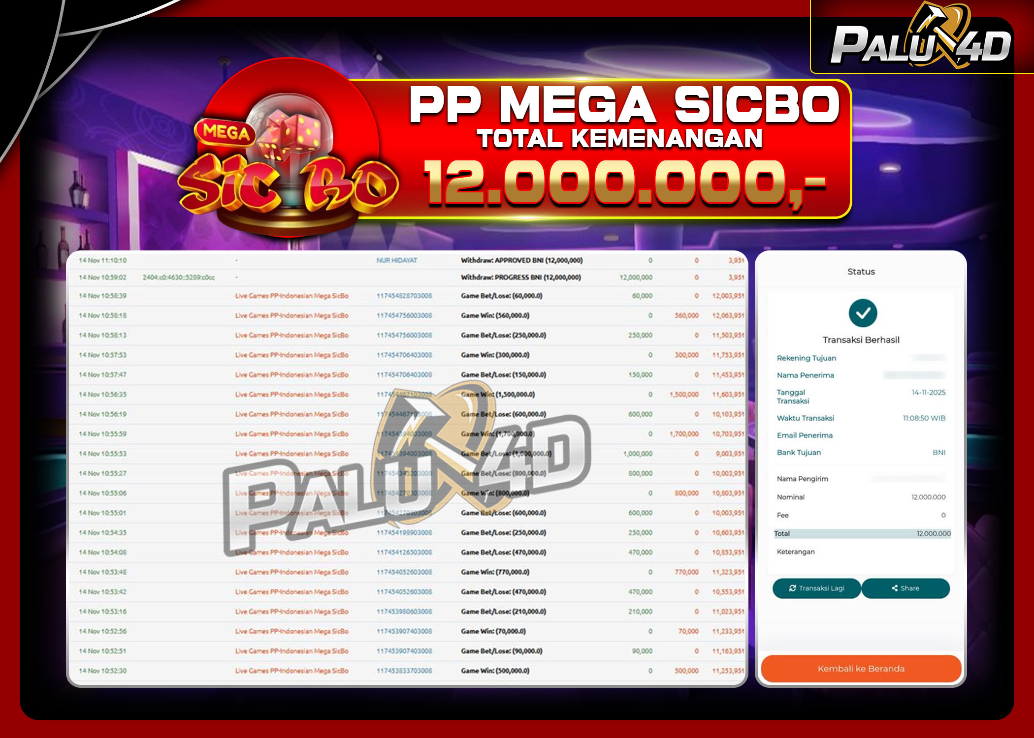 PALU4D – Menang Live Games MEGA SICBO Rp 12.000.000.,- LUNAS