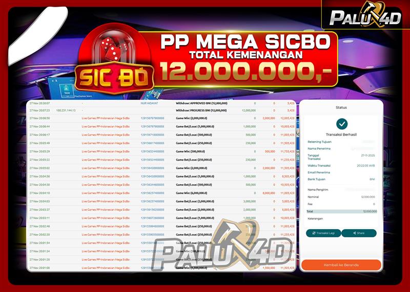 PALU4D – Selamat bagi pemenang yang mendapatkan jackpot hari ini 27 NOVEMBER 2025 di game Live Games MEGA SICBO  yang di sediakan situs palu4d dan sudah kami bayar lunas. Berikut data pemenang hari ini yang kami proses dengan cepat ke rekening tujuan yang terdaftar di akun selama ±10 menit.
