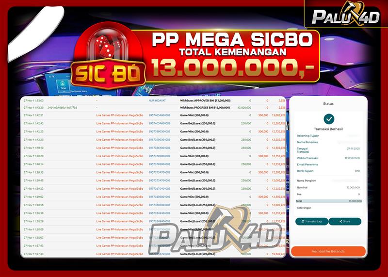 PALU4D – Selamat bagi pemenang yang mendapatkan jackpot hari ini 27 NOVEMBER 2025 di game Live Games MEGA SICBO yang di sediakan situs palu4d dan sudah kami bayar lunas. Berikut data pemenang hari ini yang kami proses dengan cepat ke rekening tujuan yang terdaftar di akun selama ±10 menit.