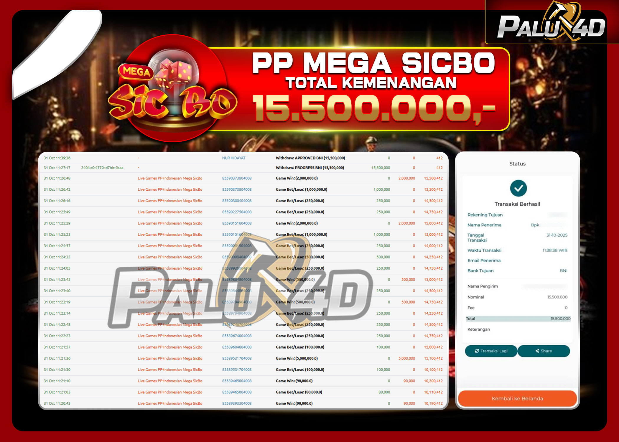 PALU4D – Selamat bagi pemenang yang mendapatkan jackpot hari ini 31 OKTOBER 2025 di game Live Games MEGA SICBO  yang di sediakan situs palu4d dan sudah kami bayar lunas. Berikut data pemenang hari ini yang kami proses dengan cepat ke rekening tujuan yang terdaftar di akun selama ±10 menit.