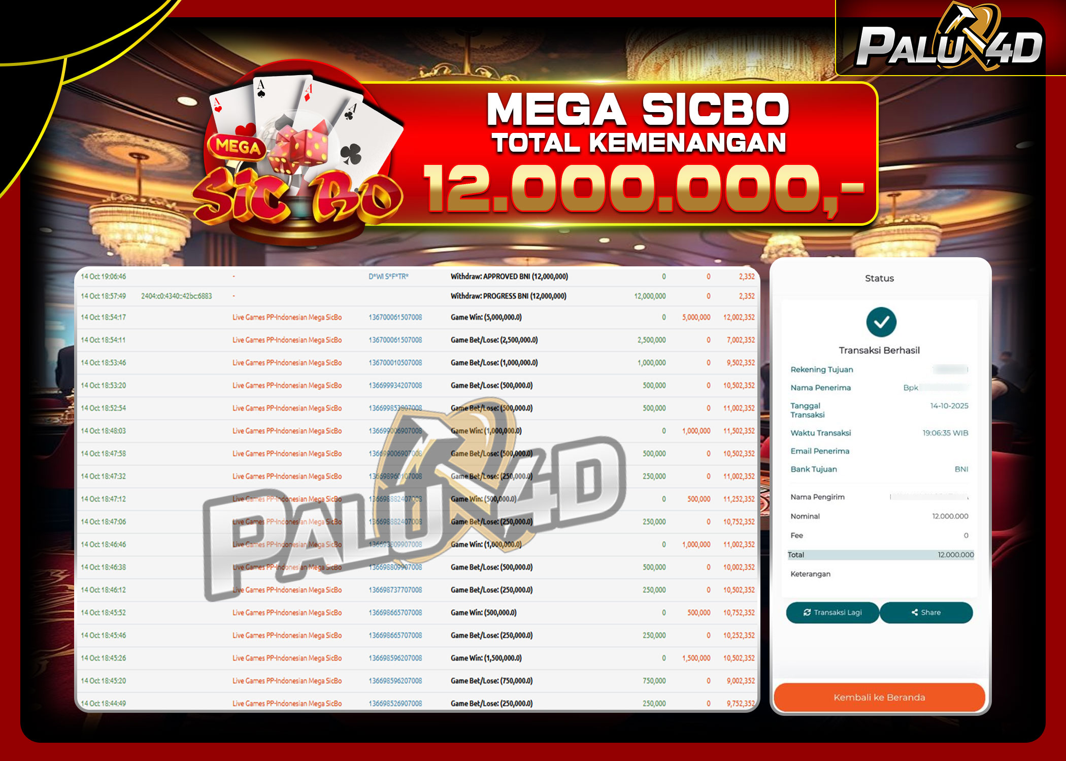 PALU4D – Selamat bagi pemenang yang mendapatkan jackpot hari ini 14 Oktober 2025 di game Live Games MEGA SICBO yang di sediakan situs palu4d dan sudah kami bayar lunas. Berikut data pemenang hari ini yang kami proses dengan cepat ke rekening tujuan yang terdaftar di akun selama ±10 menit.