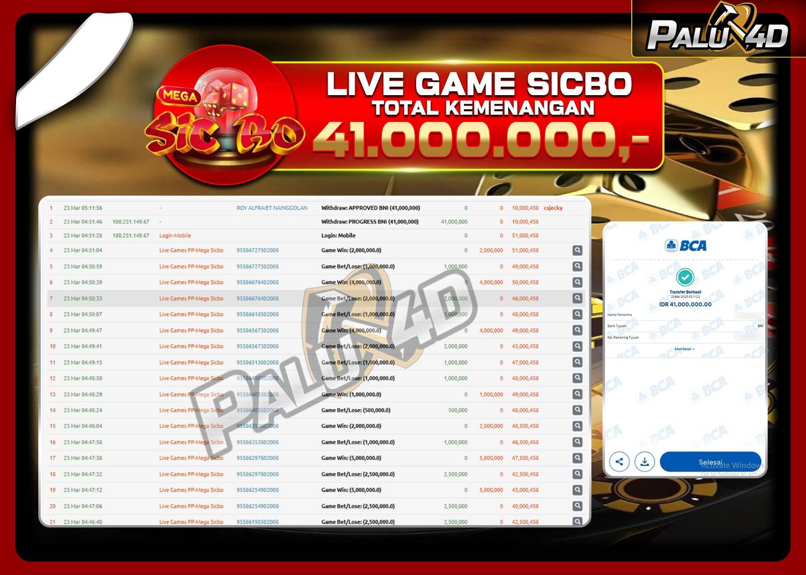 PALU4D – Selamat bagi pemenang yang mendapatkan jackpot hari ini 23 Maret 2025 di game Live Games MEGA SICBO yang di sediakan situs palu4d dan sudah kami bayar lunas. Berikut data pemenang hari ini yang kami proses dengan cepat ke rekening tujuan yang terdaftar di akun selama ±10 menit.