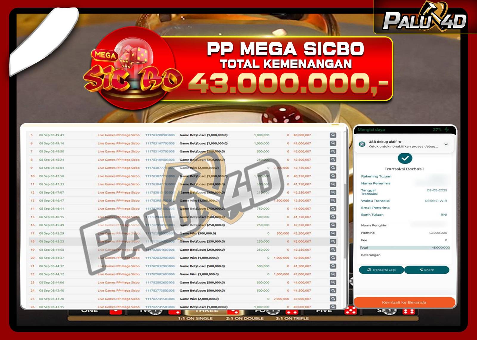 PALU4D – Selamat bagi pemenang yang mendapatkan jackpot hari ini 08 September 2025 di game Live Games MEGA SICBO yang di sediakan situs palu4d dan sudah kami bayar lunas. Berikut data pemenang hari ini yang kami proses dengan cepat ke rekening tujuan yang terdaftar di akun selama ±10 menit.