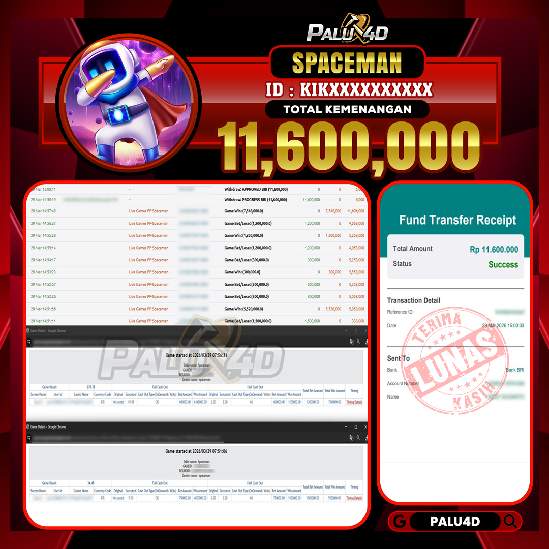 PALU4D – Selamat bagi pemenang yang mendapatkan jackpot hari ini 29 MARET 2026 di game Live Games SPACEMAN  yang di sediakan situs palu4d dan sudah kami bayar lunas. Berikut data pemenang hari ini yang kami proses dengan cepat ke rekening tujuan yang terdaftar di akun selama ±10 menit.