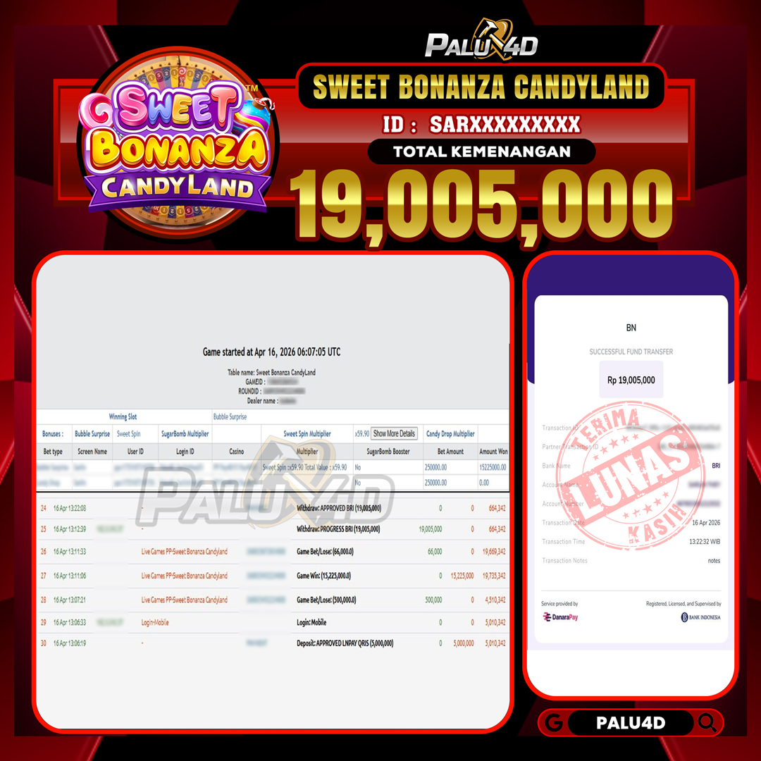 PALU4D – Selamat bagi pemenang yang mendapatkan jackpot hari ini 16 APRIL 2026 di game Live Games SWEET BONANZA CANDYLAND yang di sediakan situs palu4d dan sudah kami bayar lunas. Berikut data pemenang hari ini yang kami proses dengan cepat ke rekening tujuan yang terdaftar di akun selama ±10 menit.