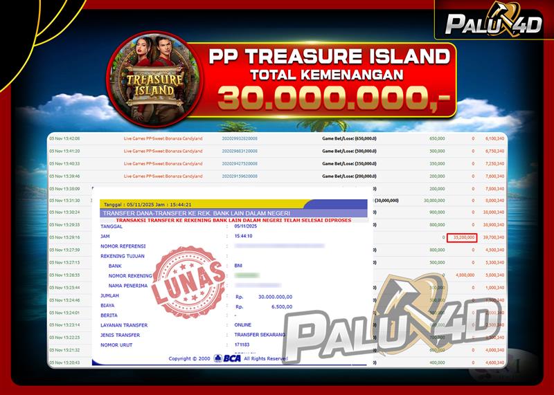 PALU4D – Selamat bagi pemenang yang mendapatkan jackpot hari ini 05 NOVEMBER 2025 di game Live Games TREASURE ISLAND yang di sediakan situs palu4d dan sudah kami bayar lunas. Berikut data pemenang hari ini yang kami proses dengan cepat ke rekening tujuan yang terdaftar di akun selama ±10 menit.