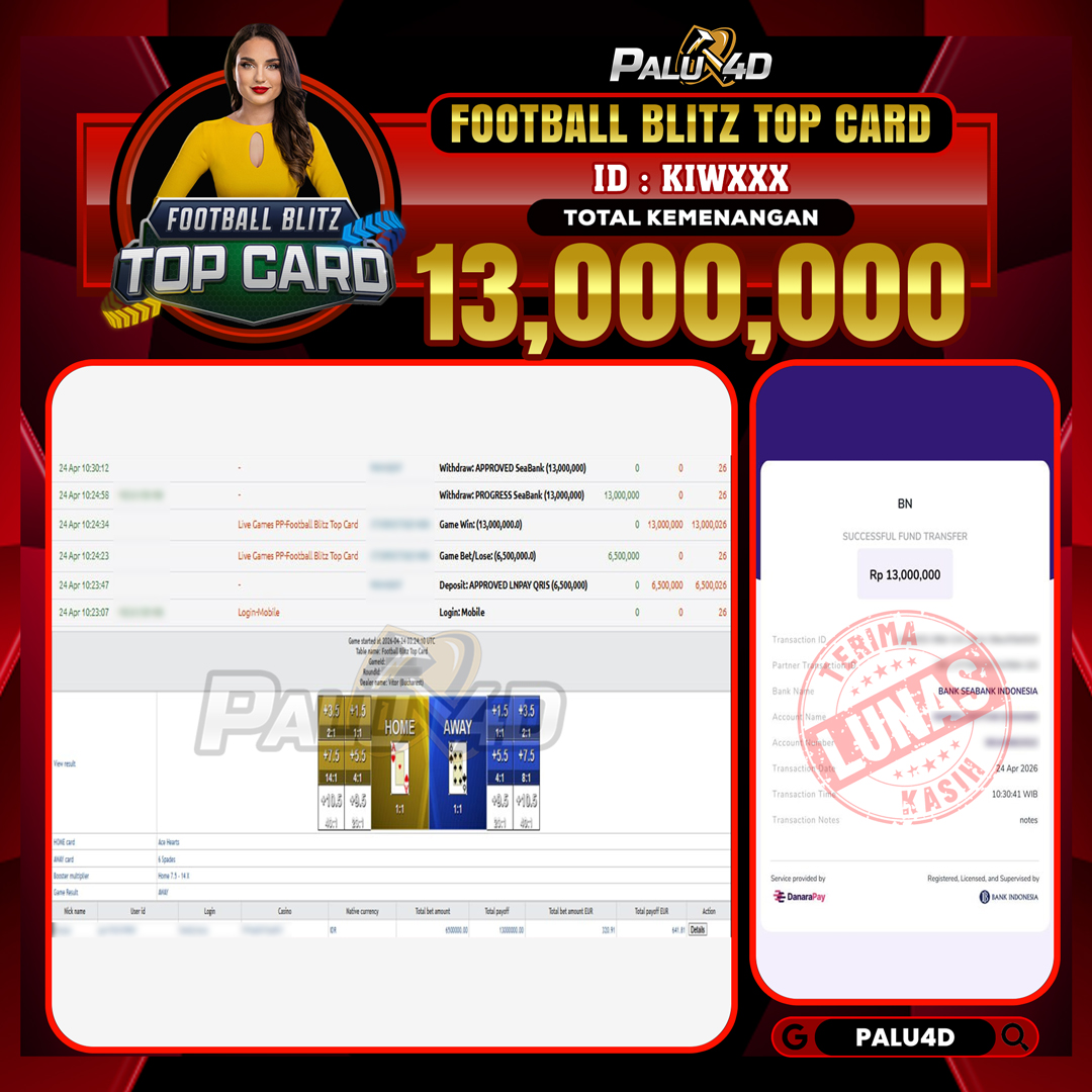 PALU4D – Selamat bagi pemenang yang mendapatkan jackpot hari ini 24 APRIL 2026 di game Sportbook TARUHAN BOLA yang di sediakan situs palu4d dan sudah kami bayar lunas. Berikut data pemenang hari ini yang kami proses dengan cepat ke rekening tujuan yang terdaftar di akun selama ±10 menit.