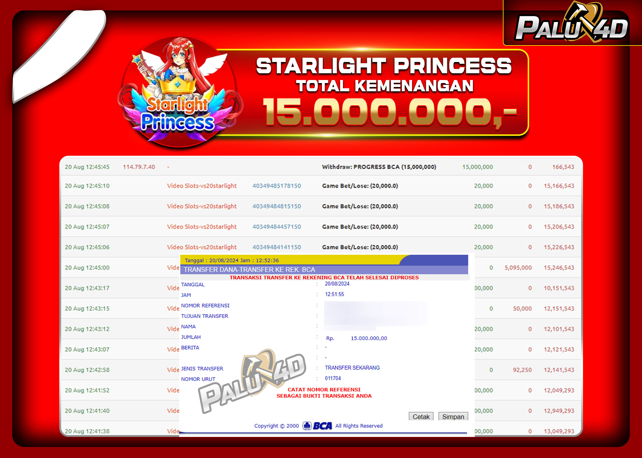 PALU4D – Selamat bagi pemenang yang mendapatkan jackpot hari ini 20 Agustus 2024 di game Slot STARLIGHT PRINCESS yang di sediakan situs palu4d dan sudah kami bayar lunas. Berikut data pemenang hari ini yang kami proses dengan cepat ke rekening tujuan yang terdaftar di akun selama ±10 menit.