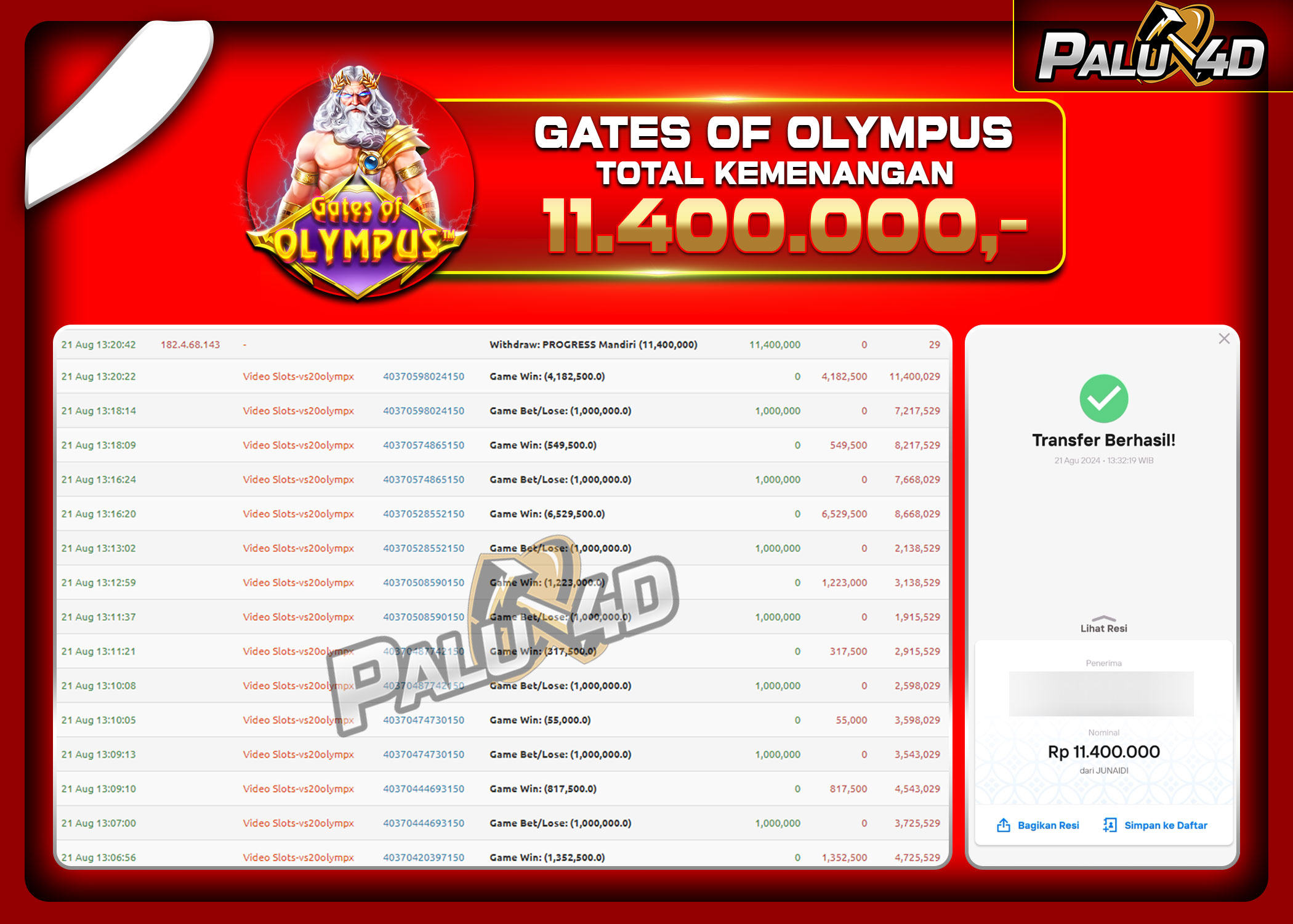 PALU4D – Selamat bagi pemenang yang mendapatkan jackpot hari ini 22 Agustus 2024 di game Slot GATES OF OLYMPUS yang di sediakan situs palu4d dan sudah kami bayar lunas. Berikut data pemenang hari ini yang kami proses dengan cepat ke rekening tujuan yang terdaftar di akun selama ±10 menit.