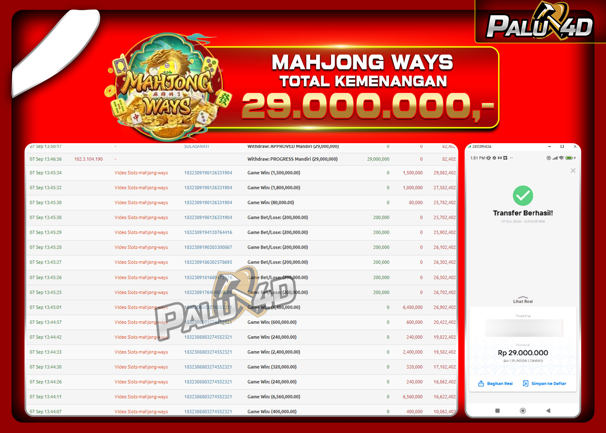 PALU4D – Selamat bagi pemenang yang mendapatkan jackpot hari ini 7 September 2024 di game Slot MAHJONG WAYS yang di sediakan situs palu4d dan sudah kami bayar lunas. Berikut data pemenang hari ini yang kami proses dengan cepat ke rekening tujuan yang terdaftar di akun selama ±10 menit.