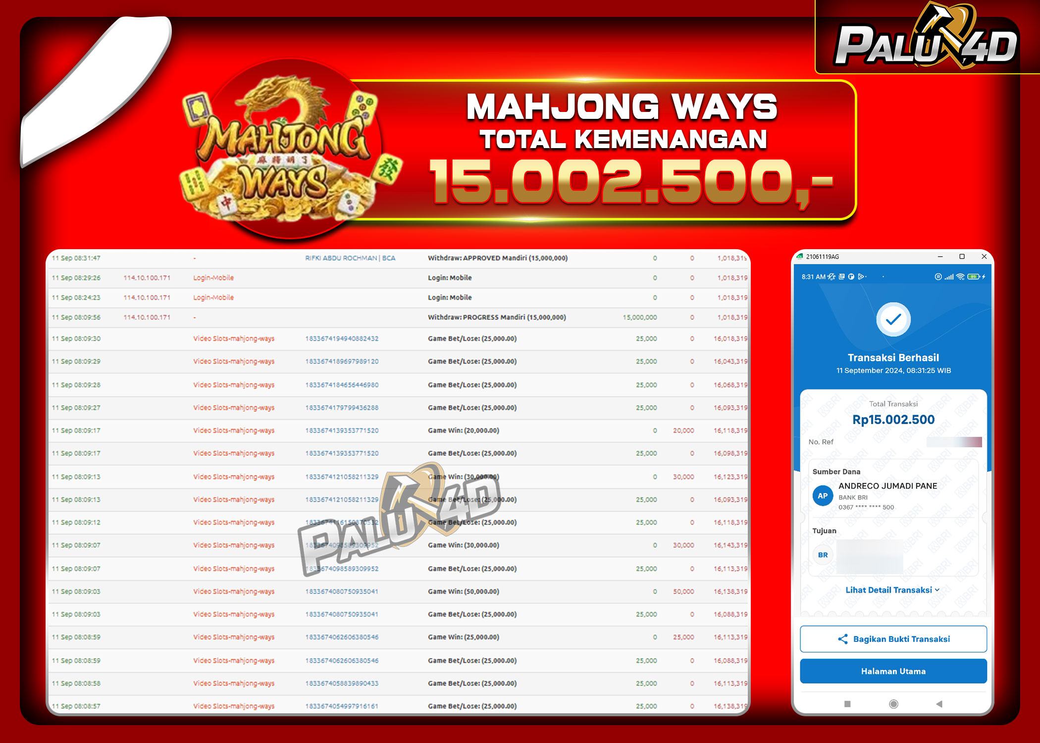 PALU4D – Selamat bagi pemenang yang mendapatkan jackpot hari ini 7 September 2024 di game Slot MAHJONG WAYS yang di sediakan situs palu4d dan sudah kami bayar lunas. Berikut data pemenang hari ini yang kami proses dengan cepat ke rekening tujuan yang terdaftar di akun selama ±10 menit.