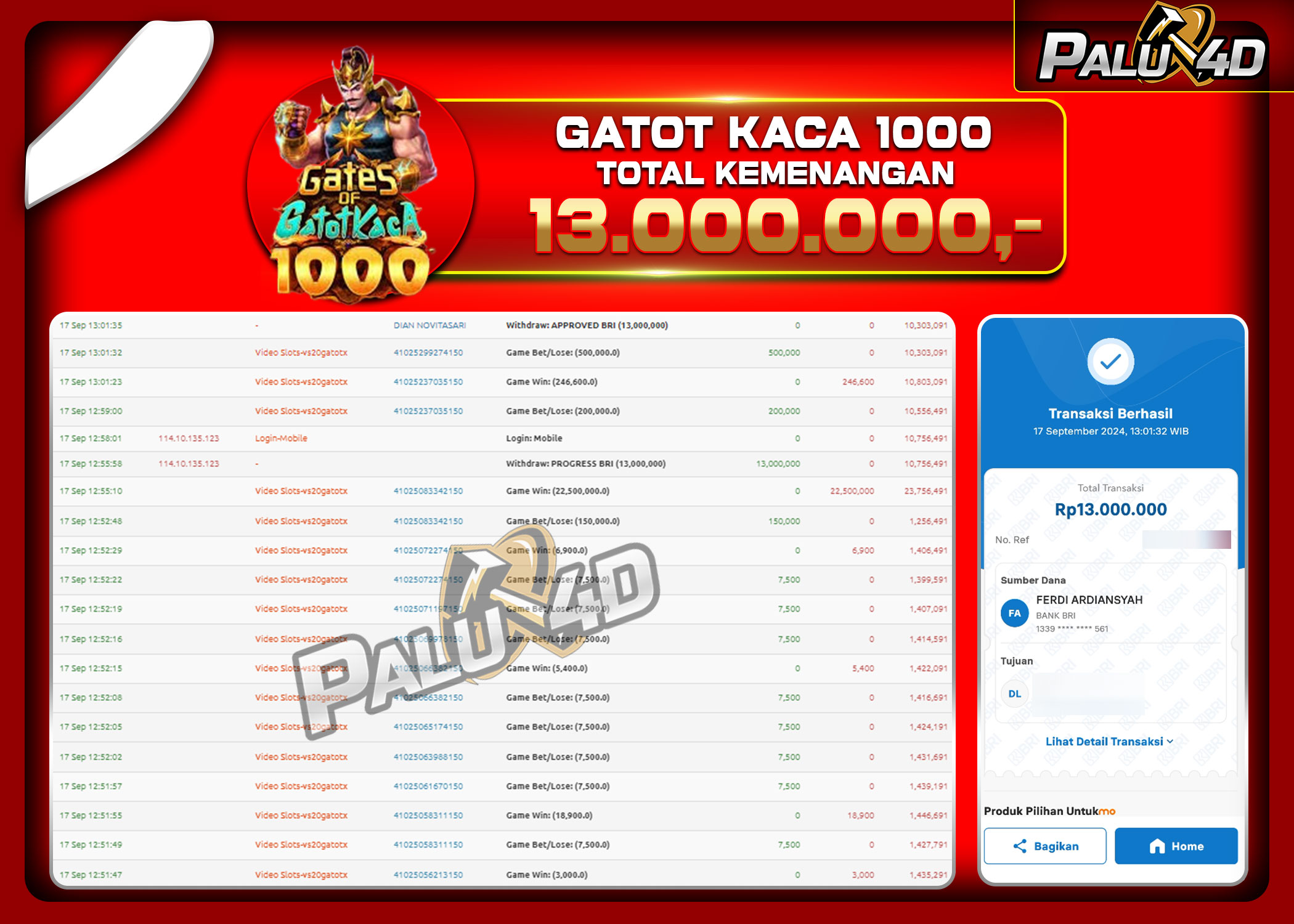 PALU4D – Selamat bagi pemenang yang mendapatkan jackpot hari ini 17 September 2024 di game Slot GATES OF GATOT KACA yang di sediakan situs palu4d dan sudah kami bayar lunas. Berikut data pemenang hari ini yang kami proses dengan cepat ke rekening tujuan yang terdaftar di akun selama ±10 menit.