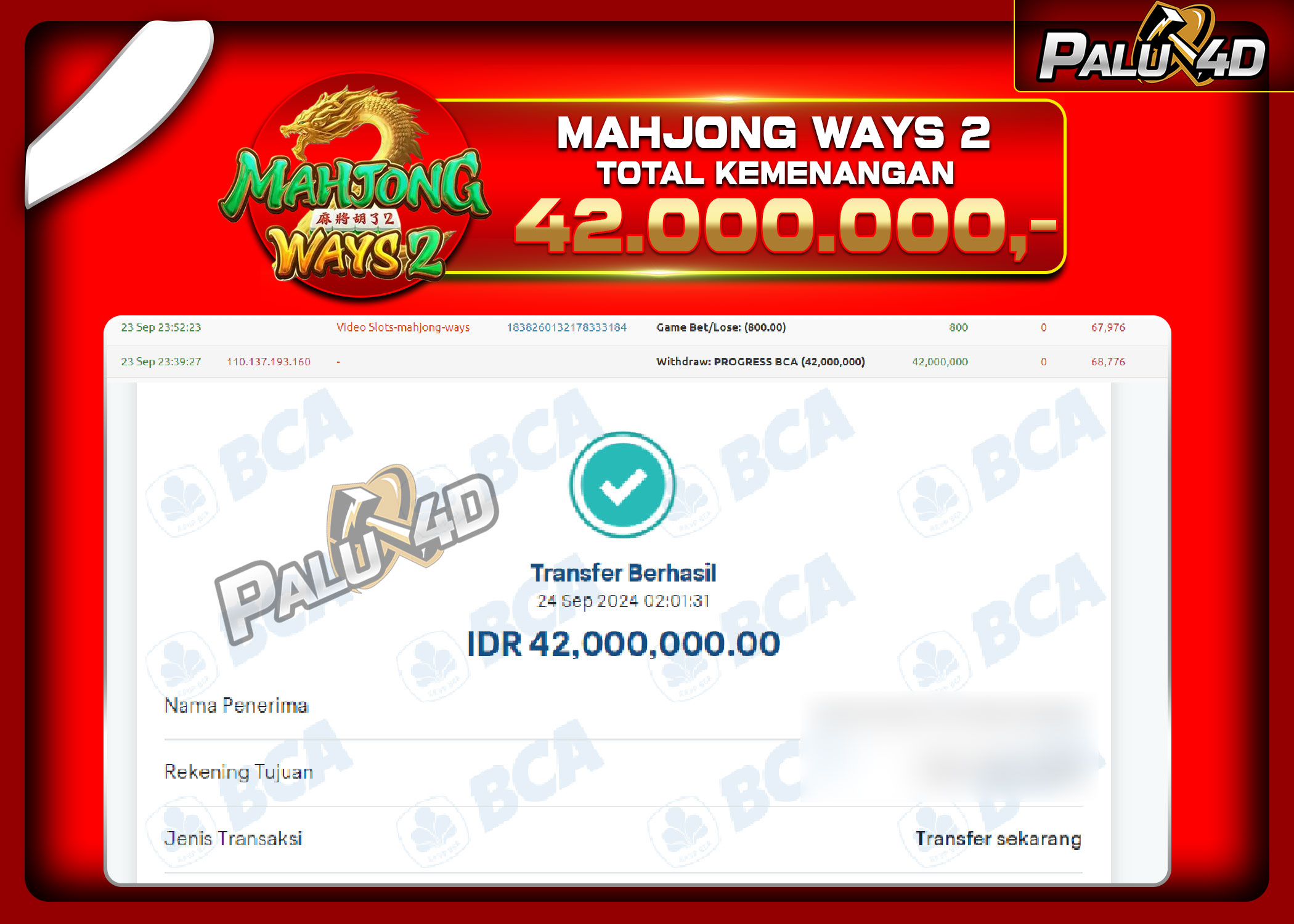 PALU4D – Selamat bagi pemenang yang mendapatkan jackpot hari ini 23 September 2024 di game Slot MAHJONG WAYS yang di sediakan situs palu4d dan sudah kami bayar lunas. Berikut data pemenang hari ini yang kami proses dengan cepat ke rekening tujuan yang terdaftar di akun selama ±10 menit.