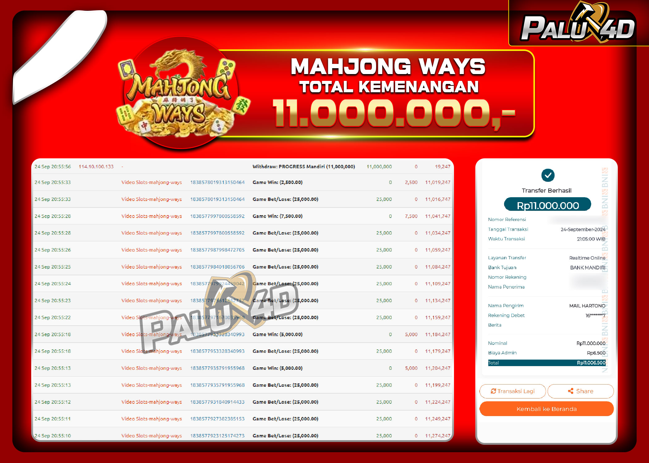 PALU4D – Selamat bagi pemenang yang mendapatkan jackpot hari ini 24 September 2024 di game Slot MAHJONG WAYS  yang di sediakan situs palu4d dan sudah kami bayar lunas. Berikut data pemenang hari ini yang kami proses dengan cepat ke rekening tujuan yang terdaftar di akun selama ±10 menit.