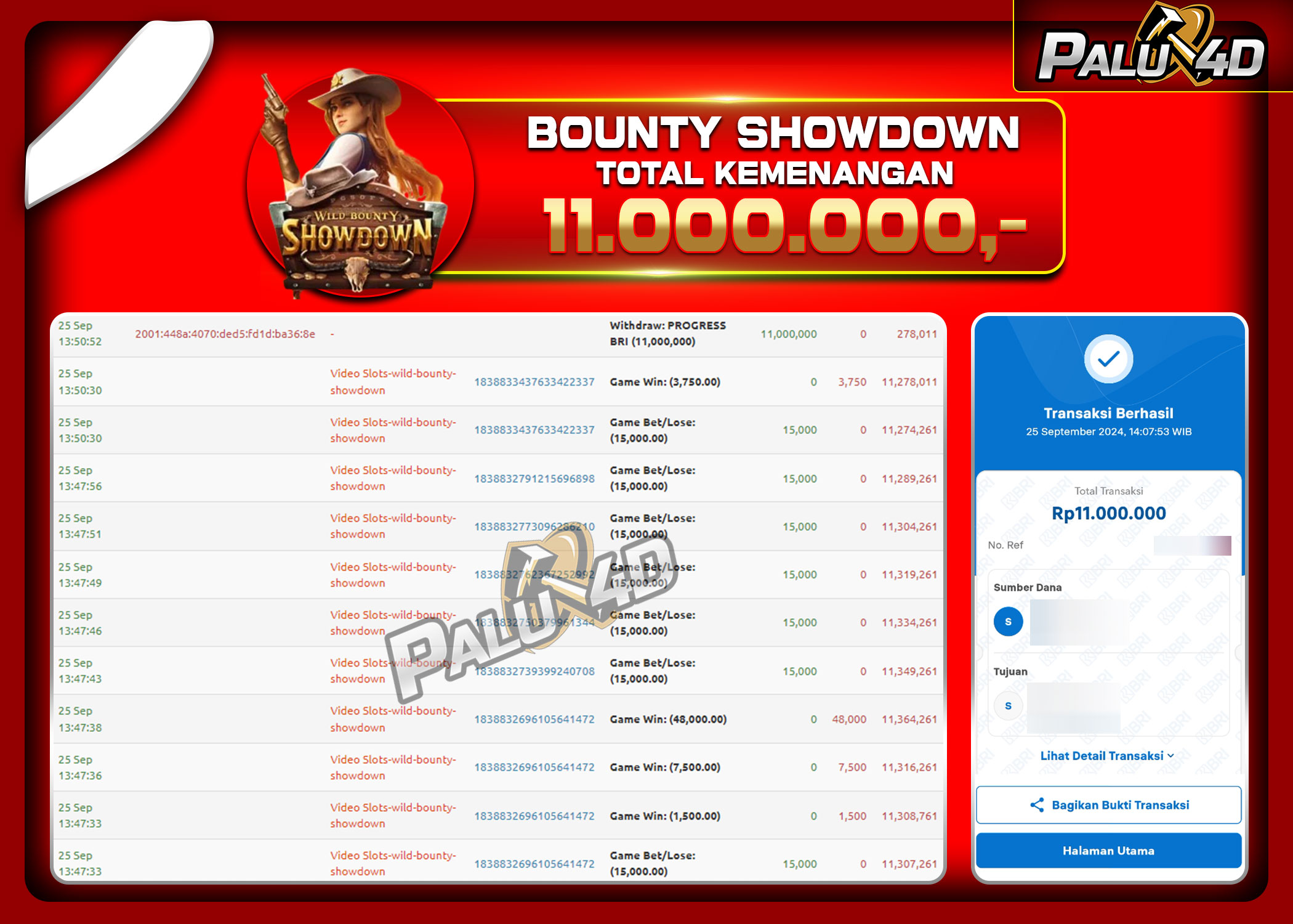 PALU4D – Selamat bagi pemenang yang mendapatkan jackpot hari ini 25 September 2024 di game Slot WILD BOUNTY SHOWDOWN yang di sediakan situs palu4d dan sudah kami bayar lunas. Berikut data pemenang hari ini yang kami proses dengan cepat ke rekening tujuan yang terdaftar di akun selama ±10 menit.