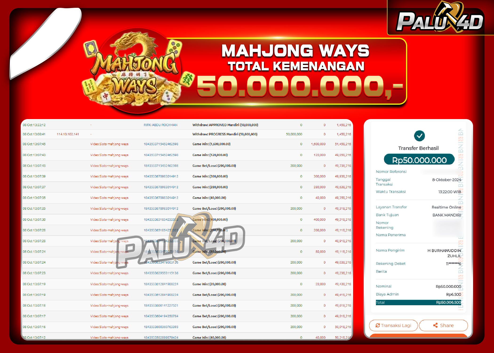PALU4D – Menang Slot MAHJONG WAYS Rp.50.000.000.,- LUNAS