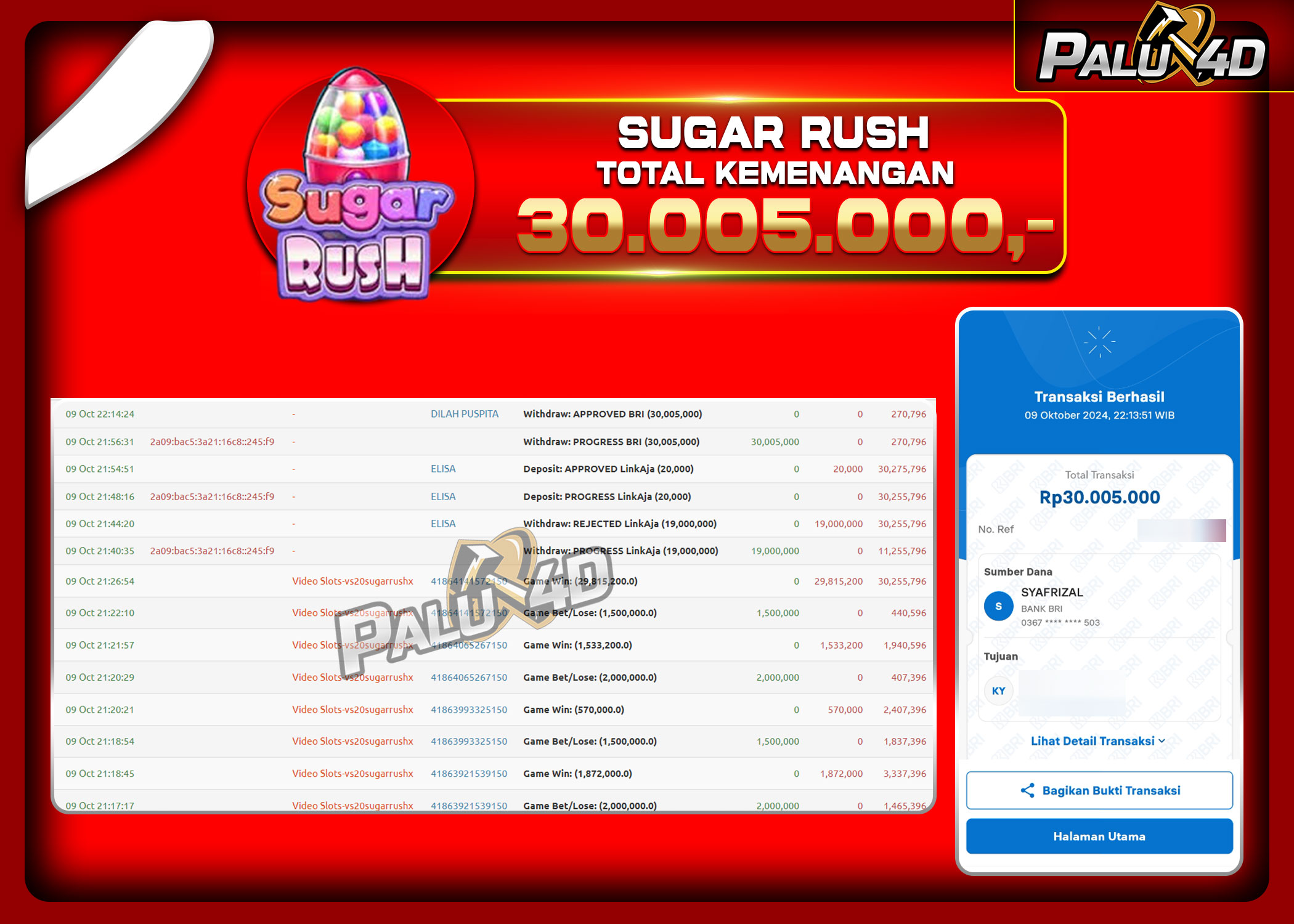 PALU4D – Selamat bagi pemenang yang mendapatkan jackpot hari ini 09 Oktober 2024 di game Slot SUGAR RUSH  yang di sediakan situs palu4d dan sudah kami bayar lunas. Berikut data pemenang hari ini yang kami proses dengan cepat ke rekening tujuan yang terdaftar di akun selama ±10 menit.