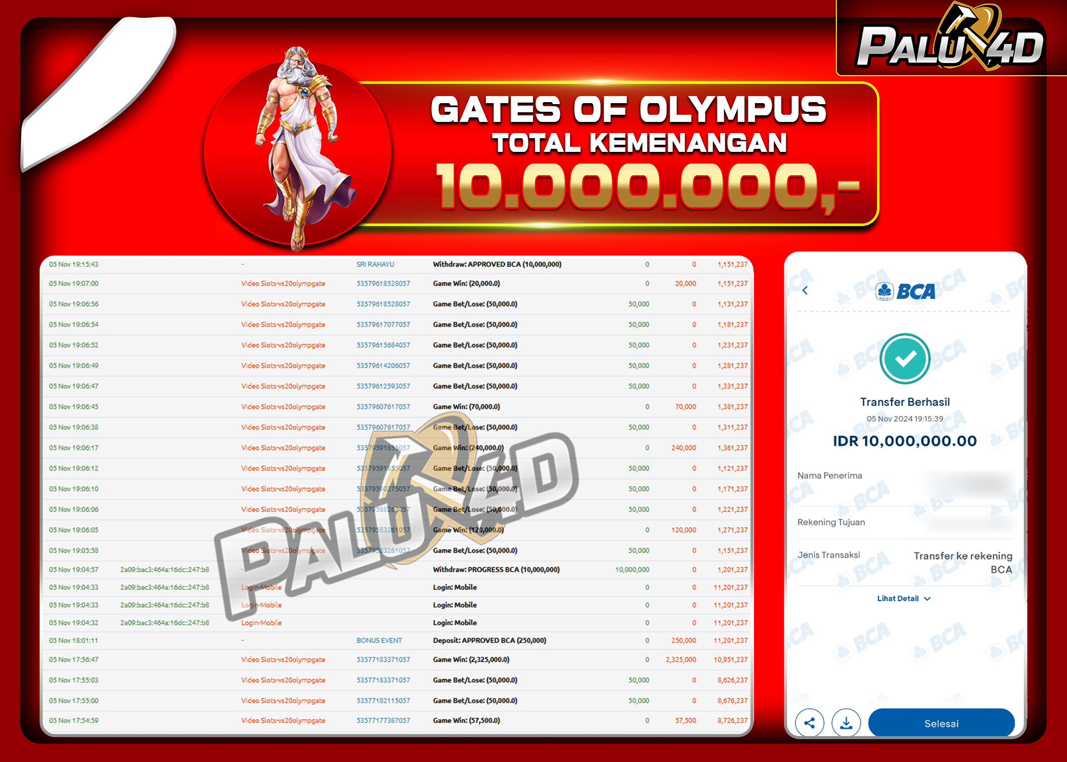 PALU4D – Selamat bagi pemenang yang mendapatkan jackpot hari ini 5 November 2024 di game Slot GATES OF OLYMPUS  yang di sediakan situs palu4d dan sudah kami bayar lunas. Berikut data pemenang hari ini yang kami proses dengan cepat ke rekening tujuan yang terdaftar di akun selama ±10 menit.