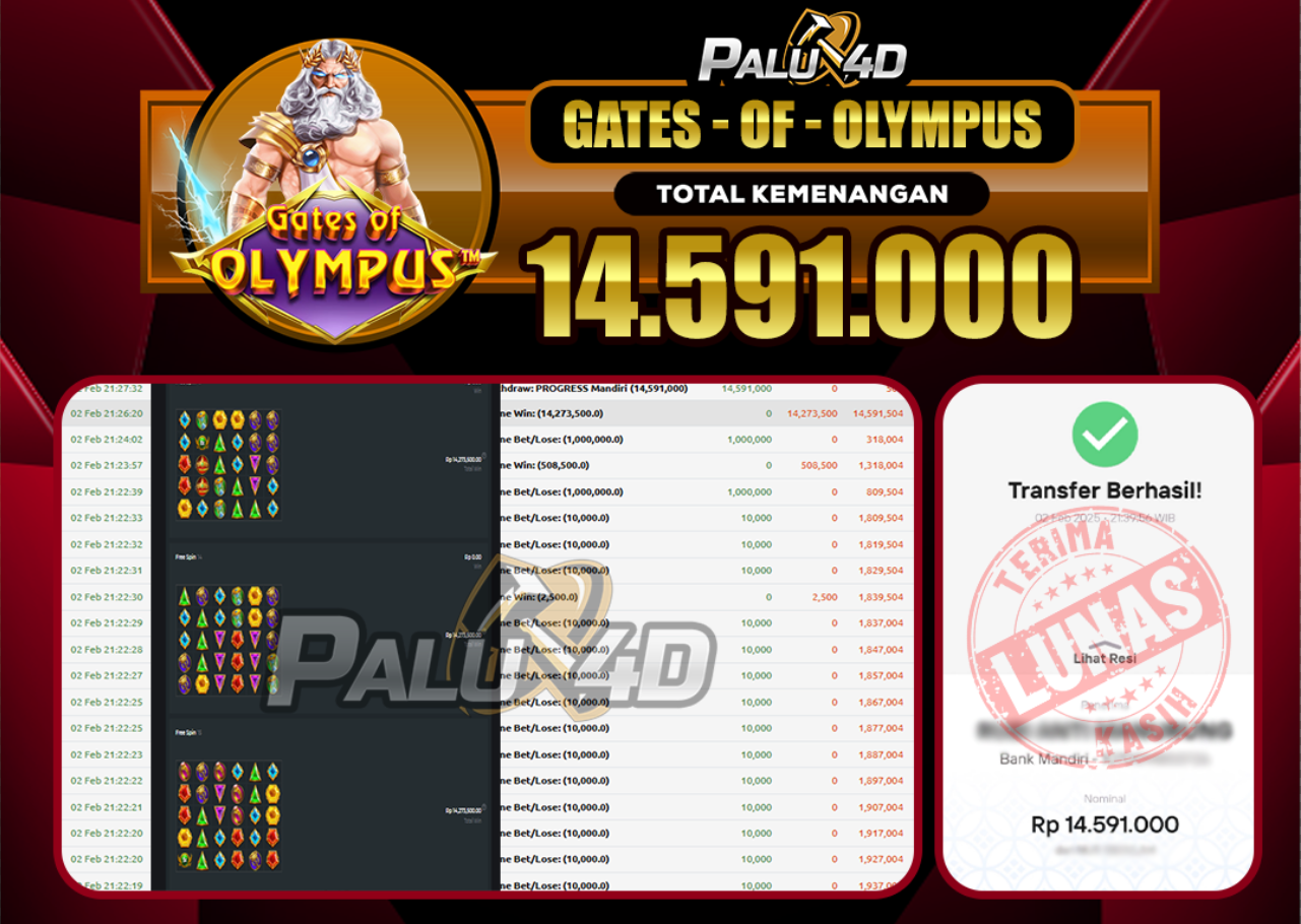 PALU4D – Selamat bagi pemenang yang mendapatkan jackpot hari ini 02 February 2025 di game Slot GATE OF OLYMPUS yang di sediakan situs palu4d dan sudah kami bayar lunas. Berikut data pemenang hari ini yang kami proses dengan cepat ke rekening tujuan yang terdaftar di akun selama ±10 menit.