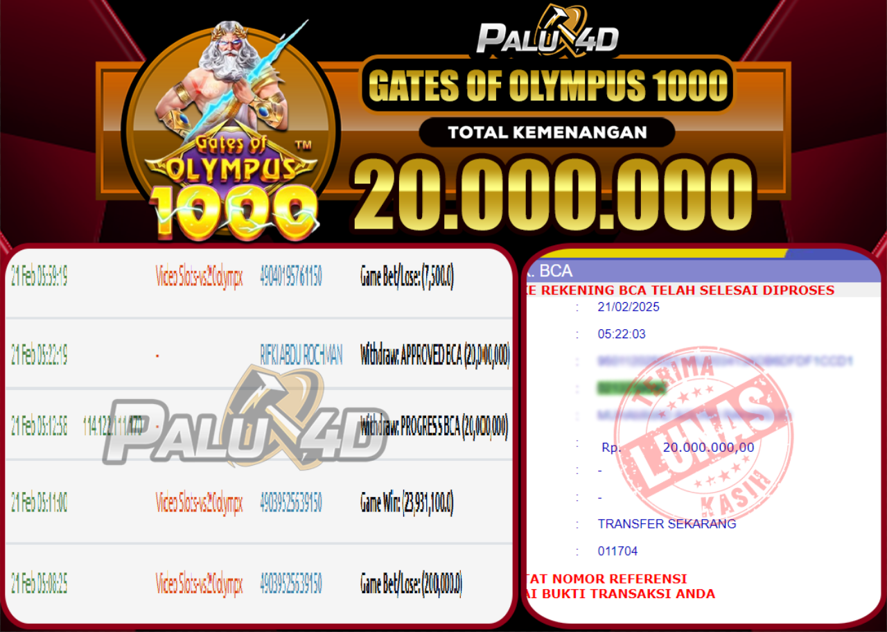 PALU4D – Selamat bagi pemenang yang mendapatkan jackpot hari ini 21 February 2025 di game Slot GATE OF OLYMPUS 1000 yang di sediakan situs palu4d dan sudah kami bayar lunas. Berikut data pemenang hari ini yang kami proses dengan cepat ke rekening tujuan yang terdaftar di akun selama ±10 menit.