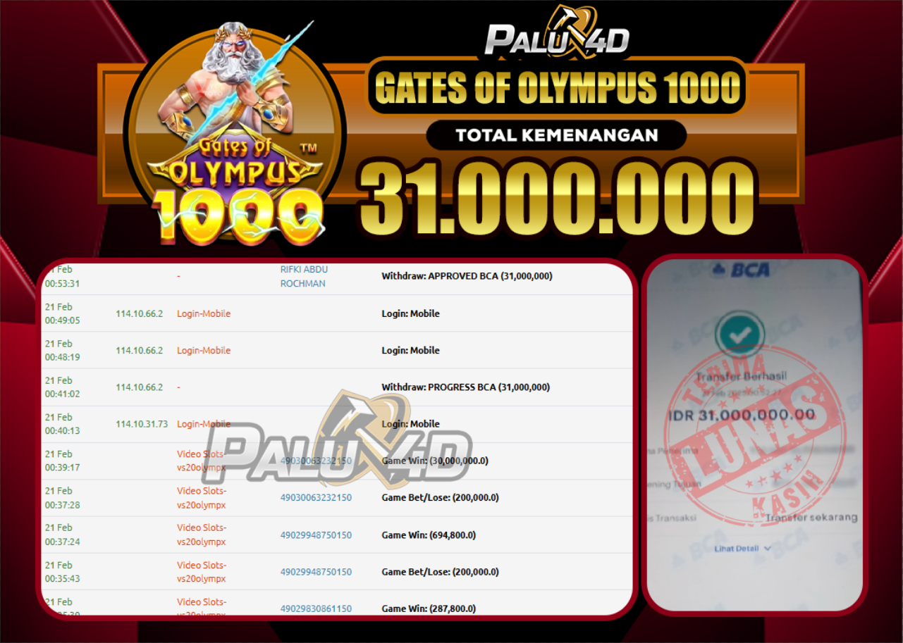 PALU4D – Menang Slot GATE OF OLYMPUS 1000 Rp.31.000.000.,- LUNAS