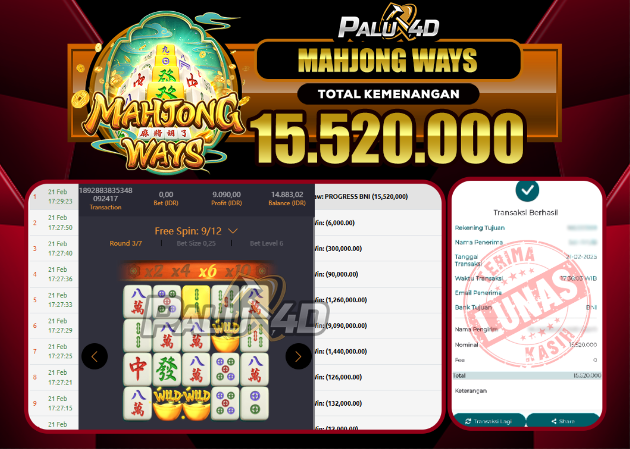 PALU4D – Selamat bagi pemenang yang mendapatkan jackpot hari ini 21 February 2025 di game Slot MAHJONG WAYS yang di sediakan situs palu4d dan sudah kami bayar lunas. Berikut data pemenang hari ini yang kami proses dengan cepat ke rekening tujuan yang terdaftar di akun selama ±10 menit.