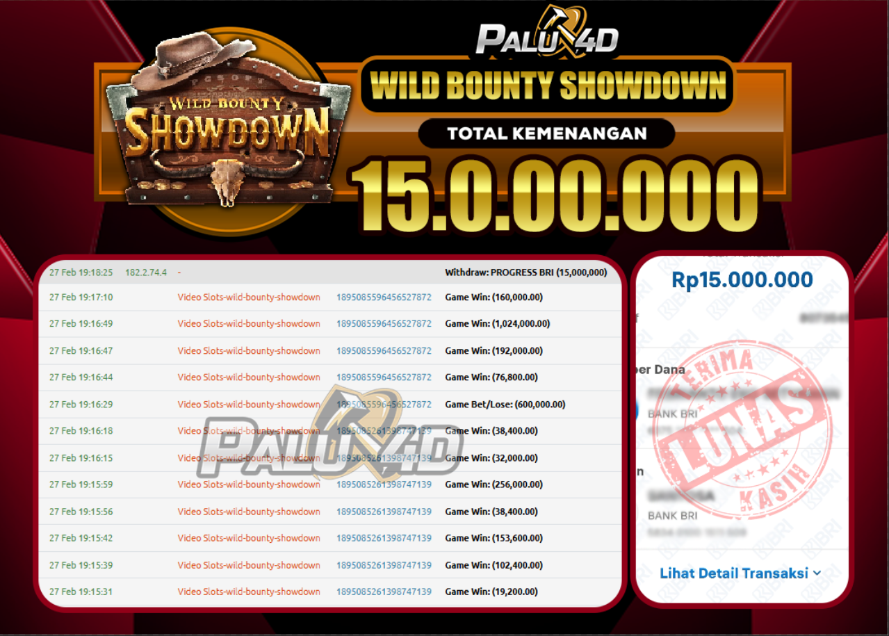 PALU4D – Selamat bagi pemenang yang mendapatkan jackpot hari ini 27 February 2025 di game Slot WILD BOUNTY SHOWDOWN  yang di sediakan situs palu4d dan sudah kami bayar lunas. Berikut data pemenang hari ini yang kami proses dengan cepat ke rekening tujuan yang terdaftar di akun selama ±10 menit.