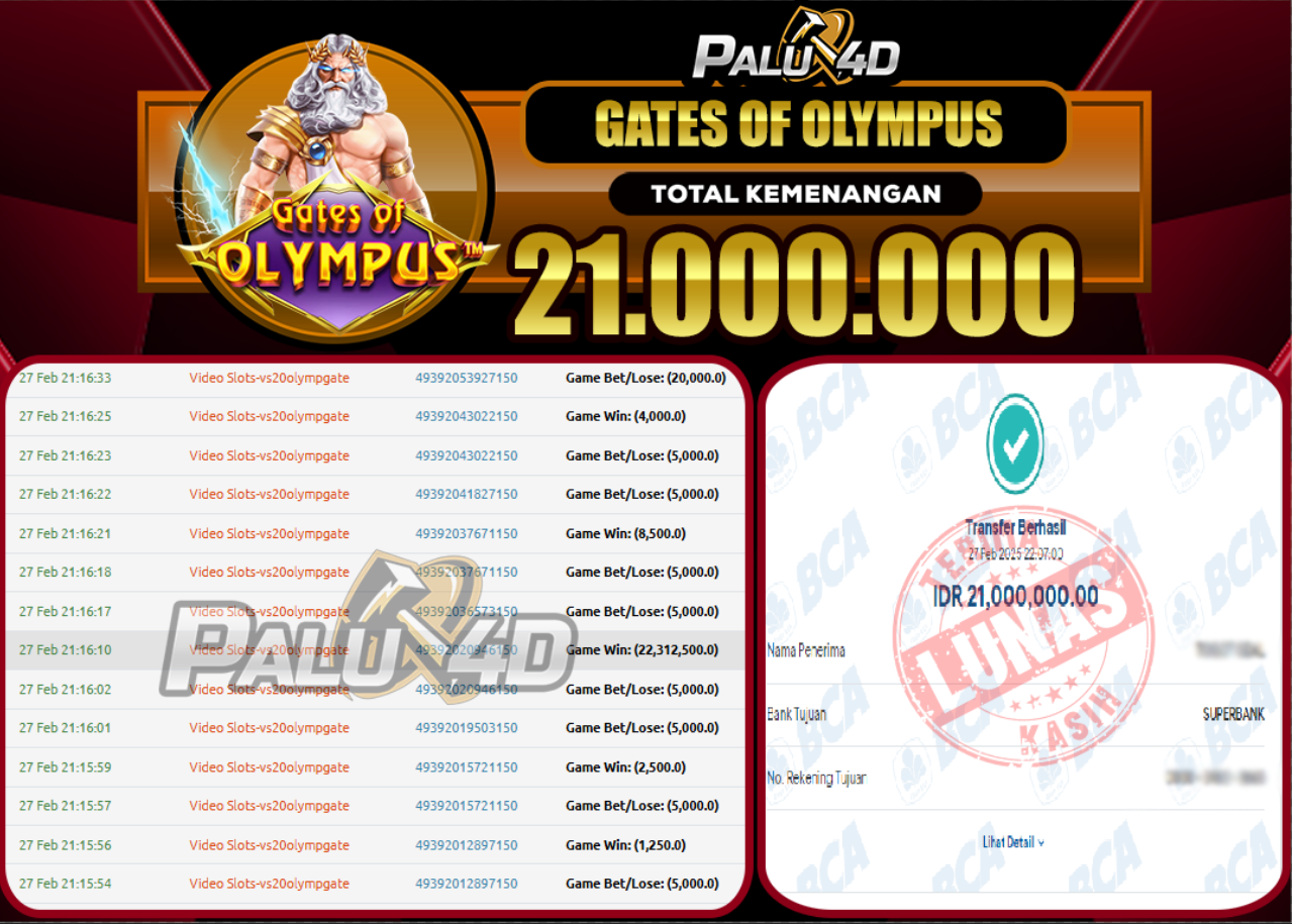 PALU4D – Selamat bagi pemenang yang mendapatkan jackpot hari ini 27 February 2025 di game Slot GATE OF OLYMPUS yang di sediakan situs palu4d dan sudah kami bayar lunas. Berikut data pemenang hari ini yang kami proses dengan cepat ke rekening tujuan yang terdaftar di akun selama ±10 menit.