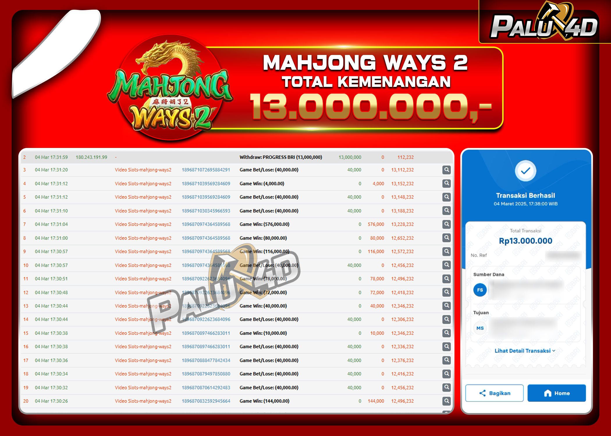 PALU4D – Menang Slot MAHJONG WAYS Rp.13.000.000.,- LUNAS